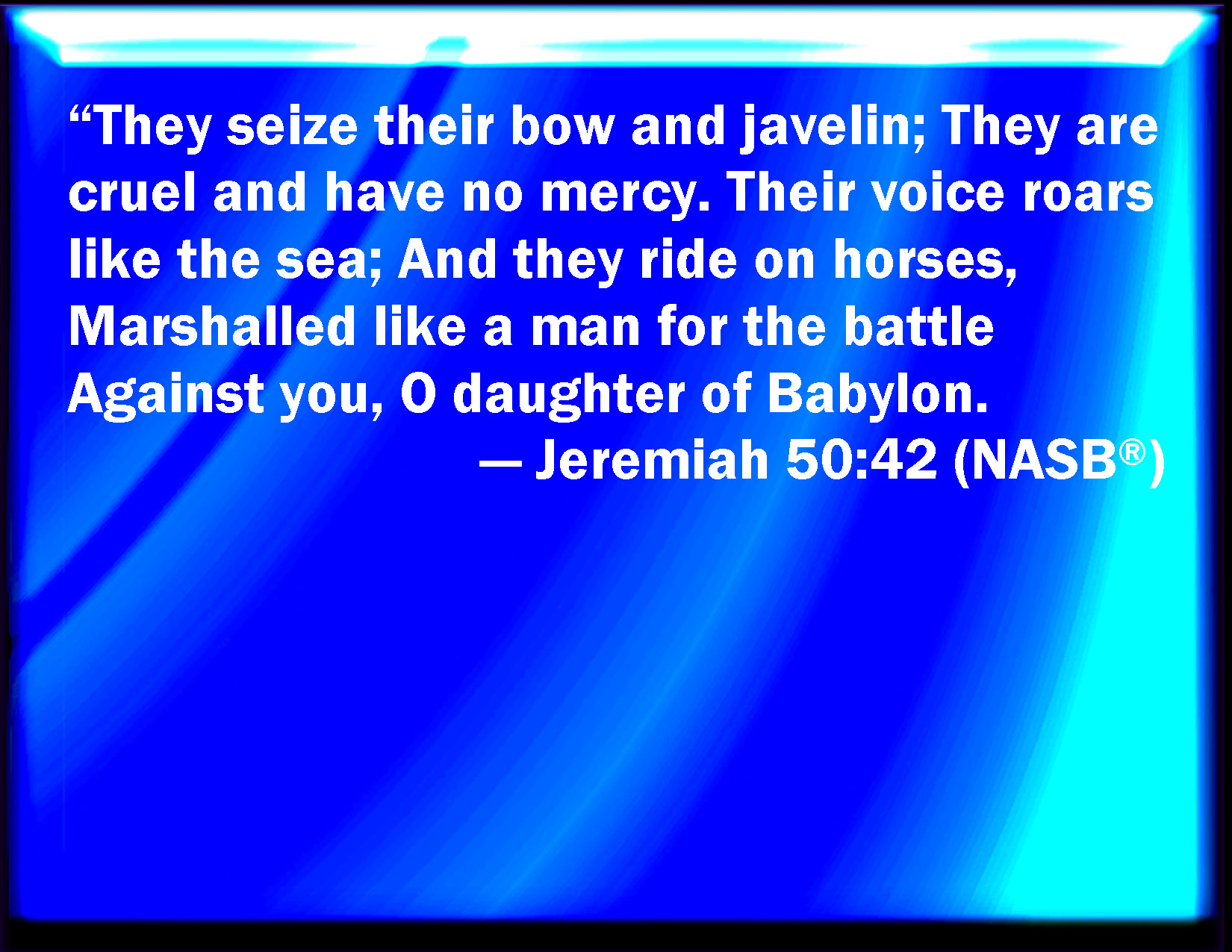 Bible Verse Slide Jeremiah 50:42 They shall hold the bow and the lance: they are cruel, and will not show mercy: their voice shall roar like the sea, and they shall ride on horses, every one put in array, like a man to the battle, against you, O daughter of Babylon. KJV: They shall hold the bow and the lance: they are cruel, and will not shew mercy: their voice shall roar like the sea, and they shall ride upon horses, every one put in array, like a man to the battle, against thee, O daughter of Babylon. DRB: They shall take the bow and the shield: they are cruel and unmerciful: their voice shall roar like the sea, and they shall ride upon horses: like a man prepared for battle against thee, O daughter of Babylon. DBT: They lay hold of bow and spear; they are cruel, and will not shew mercy; their voice roareth like the sea, and they ride upon horses set in array like a man for the battle, against thee, O daughter of Babylon. ERV: They lay hold on bow and spear; they are cruel, and have no mercy; their voice roareth like the sea, and they ride upon horses; every one set in array, as man to the battle, against thee, O daughter of Babylon. WBT: They shall hold the bow and the lance: they are cruel, and will not show mercy: their voice shall roar like the sea, and they shall ride upon horses, every one put in array, like a man to the battle, against thee, O daughter of Babylon. WEB: They lay hold on bow and spear; they are cruel, and have no mercy; their voice roars like the sea; and they ride on horses, everyone set in array, as a man to the battle, against you, daughter of Babylon. YLT: Bow and halbert they seize, Cruel are they, and they have no mercy, Their voice as a sea soundeth, and on horses they ride, Set in array as a man for battle, Against thee, O daughter of Babylon.Links Jeremiah 50:42 NIV • Jeremiah 50:42 NLT • Jeremiah 50:42 ESV • Jeremiah 50:42 NASB • Jeremiah 50:42 KJV • Jeremiah 50:42 Interlinear • Jeremiah 50:42 Commentaries • Jeremiah 50:42 Parallel Texts • Jeremiah 50:42 Bible Apps • Jeremiah 50:42 Parallel • Bible Hub |