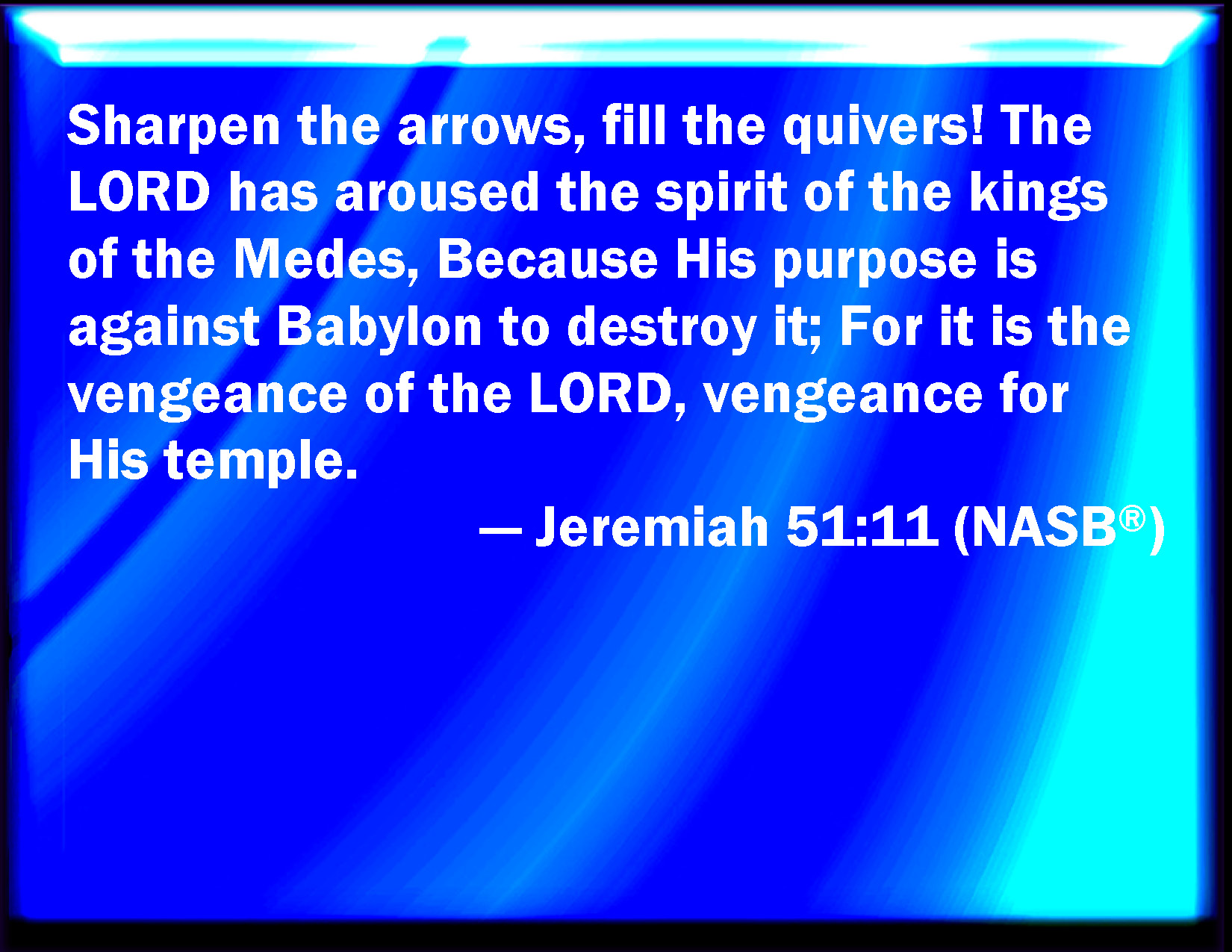 Bible Verse Slide Jeremiah 51:11 Make bright the arrows; gather the shields: the LORD has raised up the spirit of the kings of the Medes: for his device is against Babylon, to destroy it; because it is the vengeance of the LORD, the vengeance of his temple. KJV: Make bright the arrows; gather the shields: the LORD hath raised up the spirit of the kings of the Medes: for his device is against Babylon, to destroy it; because it is the vengeance of the LORD, the vengeance of his temple. DRB: Sharpen the arrows, fill the quivers, the Lord hath raised up the spirit of the kings of the Medes: and his mind is against Babylon to destroy it, because it is the vengeance of the Lord, the vengeance of his temple. DBT: Sharpen the arrows; take the shields. Jehovah hath stirred up the spirit of the kings of the Medes; for his purpose is against Babylon, to destroy it; for this is the vengeance of Jehovah, the vengeance of his temple. ERV: Make sharp the arrows; hold firm the shields: the LORD hath stirred up the spirit of the kings of the Medes; because his device is against Babylon, to destroy it: for it is the vengeance of the LORD, the vengeance of his temple. WBT: Make bright the arrows; gather the shields: the LORD hath raised up the spirit of the kings of the Medes: for his purpose is against Babylon, to destroy it; because it is the vengeance of the LORD, the vengeance of his temple. WEB: Make sharp the arrows; hold firm the shields: Yahweh has stirred up the spirit of the kings of the Medes; because his purpose is against Babylon, to destroy it: for it is the vengeance of Yahweh, the vengeance of his temple. YLT: Cleanse ye the arrows, fill the shields, Stirred up hath Jehovah the spirit of the kings of Madia, For against Babylon His device is to destroy it, For the vengeance of Jehovah it is, The vengeance of His temple.Links Jeremiah 51:11 NIV • Jeremiah 51:11 NLT • Jeremiah 51:11 ESV • Jeremiah 51:11 NASB • Jeremiah 51:11 KJV • Jeremiah 51:11 Interlinear • Jeremiah 51:11 Commentaries • Jeremiah 51:11 Parallel Texts • Jeremiah 51:11 Bible Apps • Jeremiah 51:11 Parallel • Bible Hub |
