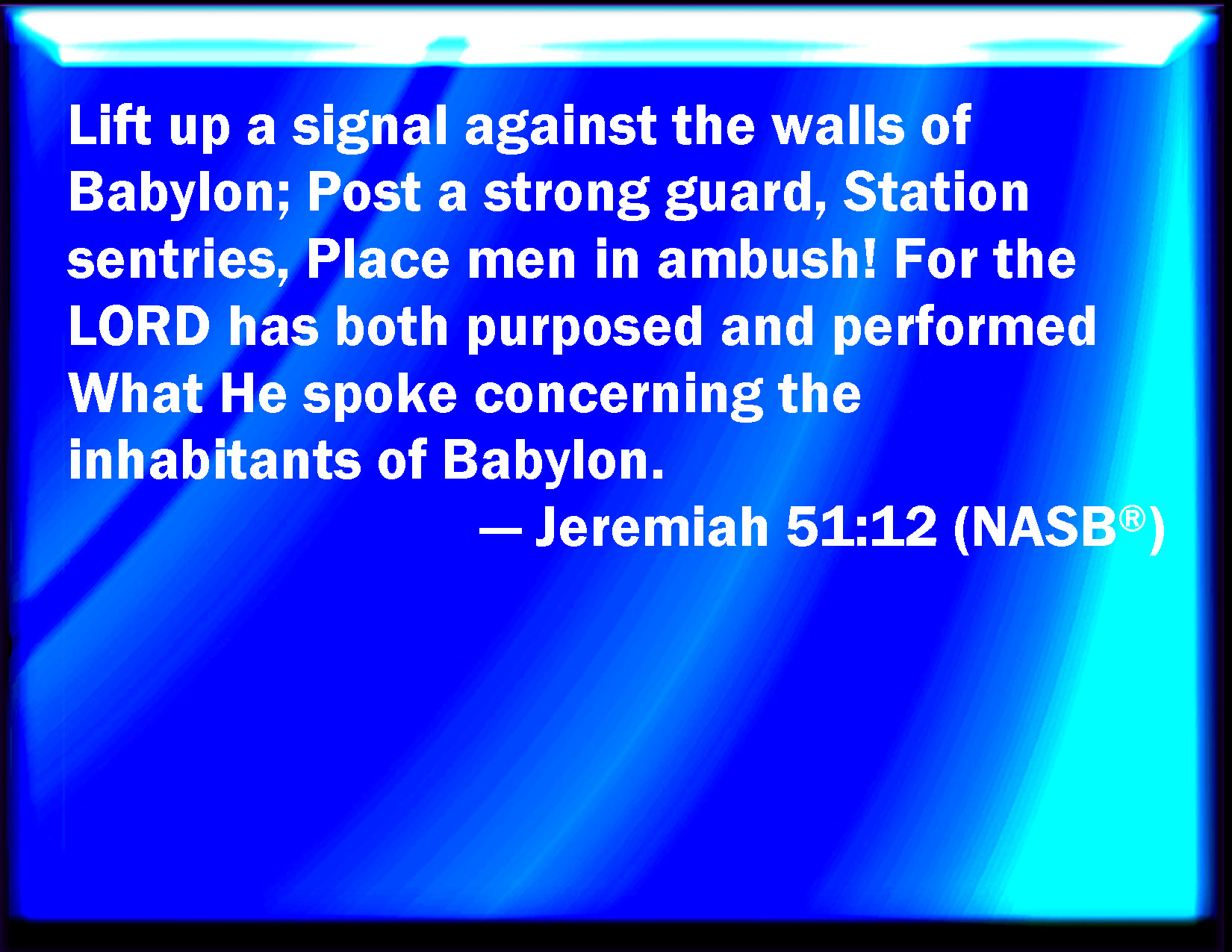 Bible Verse Slide Jeremiah 51:12 Set up the standard on the walls of Babylon, make the watch strong, set up the watchmen, prepare the ambushes: for the LORD has both devised and done that which he spoke against the inhabitants of Babylon. KJV: Set up the standard upon the walls of Babylon, make the watch strong, set up the watchmen, prepare the ambushes: for the LORD hath both devised and done that which he spake against the inhabitants of Babylon. DRB: Upon the walls of Babylon set up the standard, strengthen the watch: set up the watchmen, prepare the ambushes: for the Lord hath both purposed, and done all that he spoke against the inhabitants of Babylon. DBT: Lift up a banner towards the walls of Babylon, make the watch strong, set the watchmen, prepare the ambushes; for Jehovah hath both devised and done that which he spoke against the inhabitants of Babylon. ERV: Set up a standard against the walls of Babylon, make the watch strong, set the watchmen, prepare the ambushes: for the LORD hath both devised and done that which he spake concerning the inhabitants of Babylon. WBT: Set up the standard upon the walls of Babylon, make the watch strong, set up the watchmen, prepare the ambushes: for the LORD hath both devised and done that which he spoke against the inhabitants of Babylon. WEB: Set up a standard against the walls of Babylon, make the watch strong, set the watchmen, prepare the ambushes; for Yahweh has both purposed and done that which he spoke concerning the inhabitants of Babylon. YLT: Unto the walls of Babylon lift up an ensign, Strengthen the watch, Establish the watchers, prepare the ambush, For Jehovah hath both devised and done that which He spake, Concerning the inhabitants of Babylon.Links Jeremiah 51:12 NIV • Jeremiah 51:12 NLT • Jeremiah 51:12 ESV • Jeremiah 51:12 NASB • Jeremiah 51:12 KJV • Jeremiah 51:12 Interlinear • Jeremiah 51:12 Commentaries • Jeremiah 51:12 Parallel Texts • Jeremiah 51:12 Bible Apps • Jeremiah 51:12 Parallel • Bible Hub |