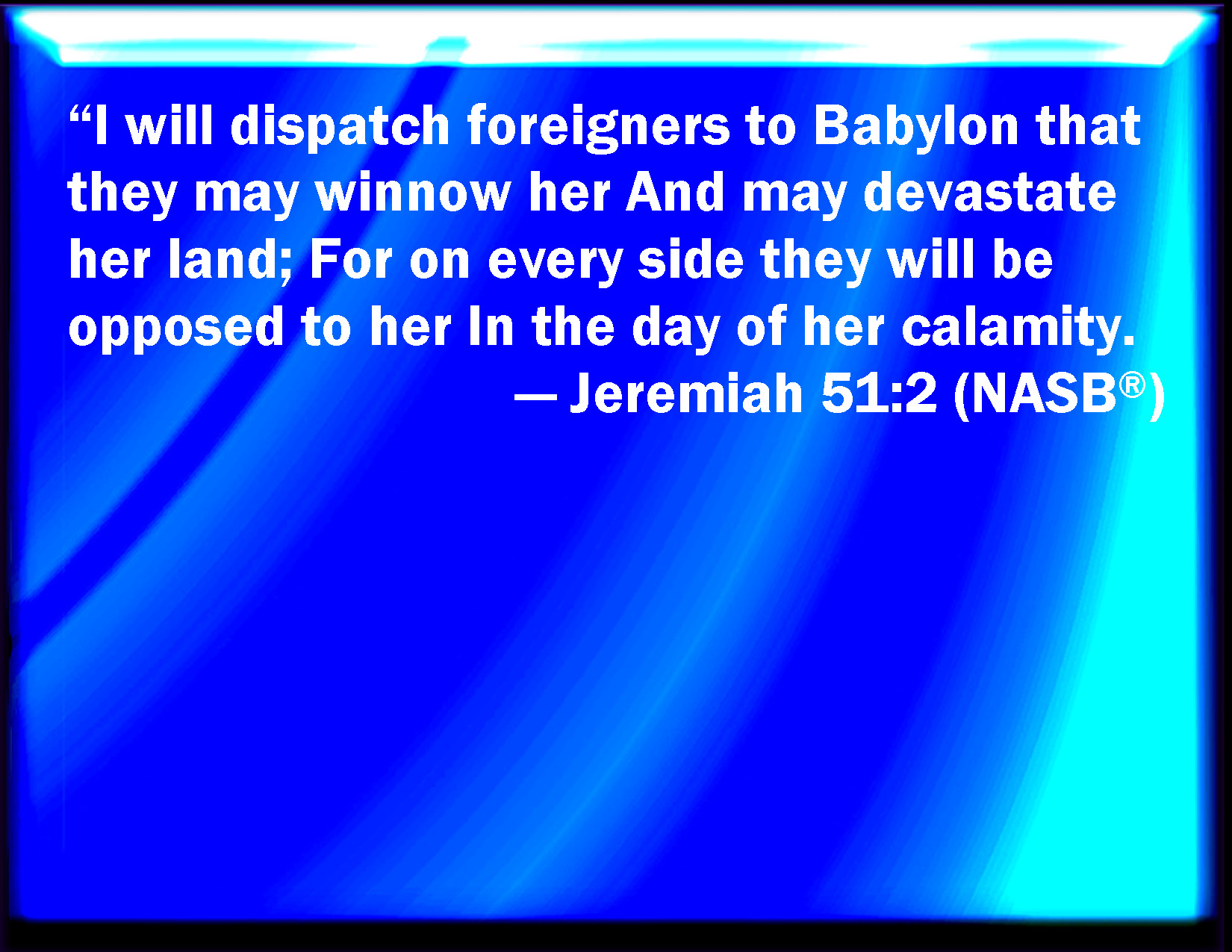 Bible Verse Slide Jeremiah 51:2 And will send to Babylon fanners, that shall fan her, and shall empty her land: for in the day of trouble they shall be against her round about. KJV: And will send unto Babylon fanners, that shall fan her, and shall empty her land: for in the day of trouble they shall be against her round about. DRB: And I will send to Babylon fanners, and they shall fan her, and shall destroy her land: for they are come upon her on every side in the day of her affliction. DBT: and I will send unto Babylon strangers, who shall fan her, and shall empty her land: for in the day of trouble they shall be against her round about. ERV: And I will send unto Babylon strangers, that shall fan her; and they shall empty her land: for in the day of trouble they shall be against her round about. WBT: And will send to Babylon fanners, that shall fan her, and shall empty her land: for in the day of trouble they shall be against her on all sides. WEB: I will send to Babylon strangers, who shall winnow her; and they shall empty her land: for in the day of trouble they shall be against her around. YLT: And I have sent to Babylon fanners, And they have fanned it, and they empty its land, For they have been against it, Round about — in the day of evil.Links Jeremiah 51:2 NIV • Jeremiah 51:2 NLT • Jeremiah 51:2 ESV • Jeremiah 51:2 NASB • Jeremiah 51:2 KJV • Jeremiah 51:2 Interlinear • Jeremiah 51:2 Commentaries • Jeremiah 51:2 Parallel Texts • Jeremiah 51:2 Bible Apps • Jeremiah 51:2 Parallel • Bible Hub |