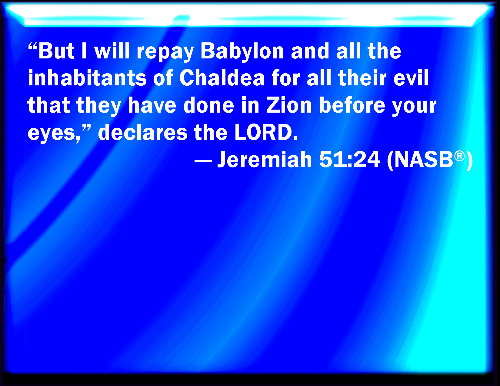 Bible Verse Slide Jeremiah 51:24 And I will render to Babylon and to all the inhabitants of Chaldea all their evil that they have done in Zion in your sight, said the LORD. KJV: And I will render unto Babylon and to all the inhabitants of Chaldea all their evil that they have done in Zion in your sight, saith the LORD. DRB: And I will render to Babylon, and to all the inhabitants of Chaldea all their evil, that they have done in Sion, before your eyes, saith the Lord. DBT: And I will render unto Babylon and to all the inhabitants of Chaldea, in your sight, all their evil which they have done in Zion, saith Jehovah. ERV: And I will render unto Babylon and to all the inhabitants of Chaldea all their evil that they have done in Zion in your sight, saith the LORD. WBT: And I will render to Babylon and to all the inhabitants of Chaldea all their evil that they have done in Zion in your sight, saith the LORD. WEB: I will render to Babylon and to all the inhabitants of Chaldea all their evil that they have done in Zion in your sight, says Yahweh. YLT: And I have recompensed to Babylon, And to all inhabitants of Chaldea, All the evil that they have done in Zion, Before your eyes — an affirmation of Jehovah.Links Jeremiah 51:24 NIV • Jeremiah 51:24 NLT • Jeremiah 51:24 ESV • Jeremiah 51:24 NASB • Jeremiah 51:24 KJV • Jeremiah 51:24 Interlinear • Jeremiah 51:24 Commentaries • Jeremiah 51:24 Parallel Texts • Jeremiah 51:24 Bible Apps • Jeremiah 51:24 Parallel • Bible Hub |