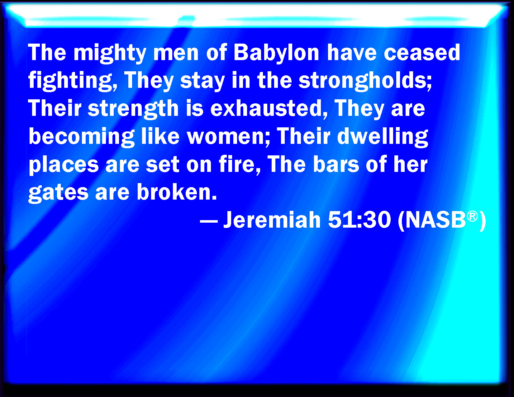 Bible Verse Slide Jeremiah 51:30 The mighty men of Babylon have declined to fight, they have remained in their holds: their might has failed; they became as women: they have burned her dwelling places; her bars are broken. KJV: The mighty men of Babylon have forborn to fight, they have remained in their holds: their might hath failed; they became as women: they have burned her dwellingplaces; her bars are broken. DRB: The valiant men of Babylon have forborne to fight, they have dwelt in holds: their strength hath failed, and they are become as women: her dwelling places are burnt, her bars are broken. DBT: The mighty men of Babylon have ceased to fight, they are sitting in the fortresses; their might hath failed, they are become as women: they have set her dwelling places on fire; her bars are broken. ERV: The mighty men of Babylon have forborne to fight, they remain in their strong holds; their might hath failed; they are become as women: her dwelling places are set on fire; her bars are broken. WBT: The mighty men of Babylon have forborne to fight, they have remained in their holds: their might hath failed; they became as women: they have burned her dwelling-places; her bars are broken. WEB: The mighty men of Babylon have forborne to fight, they remain in their strongholds; their might has failed; they are become as women: her dwelling places are set on fire; her bars are broken. YLT: Ceased have the mighty of Babylon to fight, They have remained in strongholds, Failed hath their might, they have become woman, They have burnt her tabernacles, Broken have been her bars.Links Jeremiah 51:30 NIV • Jeremiah 51:30 NLT • Jeremiah 51:30 ESV • Jeremiah 51:30 NASB • Jeremiah 51:30 KJV • Jeremiah 51:30 Interlinear • Jeremiah 51:30 Commentaries • Jeremiah 51:30 Parallel Texts • Jeremiah 51:30 Bible Apps • Jeremiah 51:30 Parallel • Bible Hub |