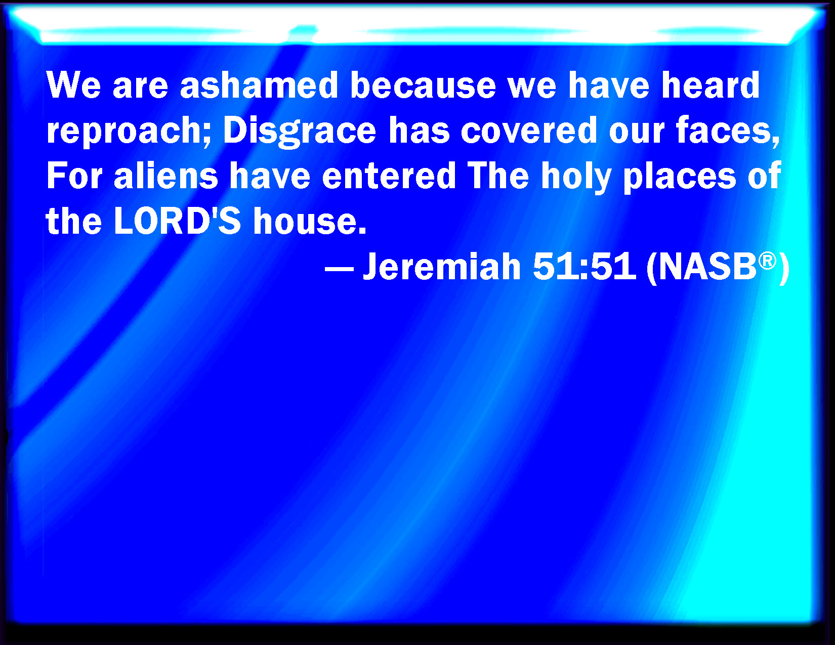 Bible Verse Slide Jeremiah 51:51 We are confounded, because we have heard reproach: shame has covered our faces: for strangers are come into the sanctuaries of the LORD's house. KJV: We are confounded, because we have heard reproach: shame hath covered our faces: for strangers are come into the sanctuaries of the LORD'S house. DRB: We are confounded, because we have heard reproach: shame hath covered our faces: because strangers are come upon the sanctuaries of the house of the Lord. DBT: We are put to shame, for we have heard reproach; confusion hath covered our face: for strangers are come into the sanctuaries of Jehovah's house. ERV: We are ashamed, because we have heard reproach; confusion hath covered our faces: for strangers are come into the sanctuaries of the LORD'S house. WBT: We are confounded, because we have heard reproach: shame hath covered our faces: for strangers are come into the sanctuaries of the LORD'S house. WEB: We are confounded, because we have heard reproach; confusion has covered our faces: for strangers are come into the sanctuaries of Yahweh's house. YLT: We have been ashamed, for we heard reproach, Covered hath shame our faces, For come in have strangers, against the sanctuaries of the house of Jehovah.Links Jeremiah 51:51 NIV • Jeremiah 51:51 NLT • Jeremiah 51:51 ESV • Jeremiah 51:51 NASB • Jeremiah 51:51 KJV • Jeremiah 51:51 Interlinear • Jeremiah 51:51 Commentaries • Jeremiah 51:51 Parallel Texts • Jeremiah 51:51 Bible Apps • Jeremiah 51:51 Parallel • Bible Hub |