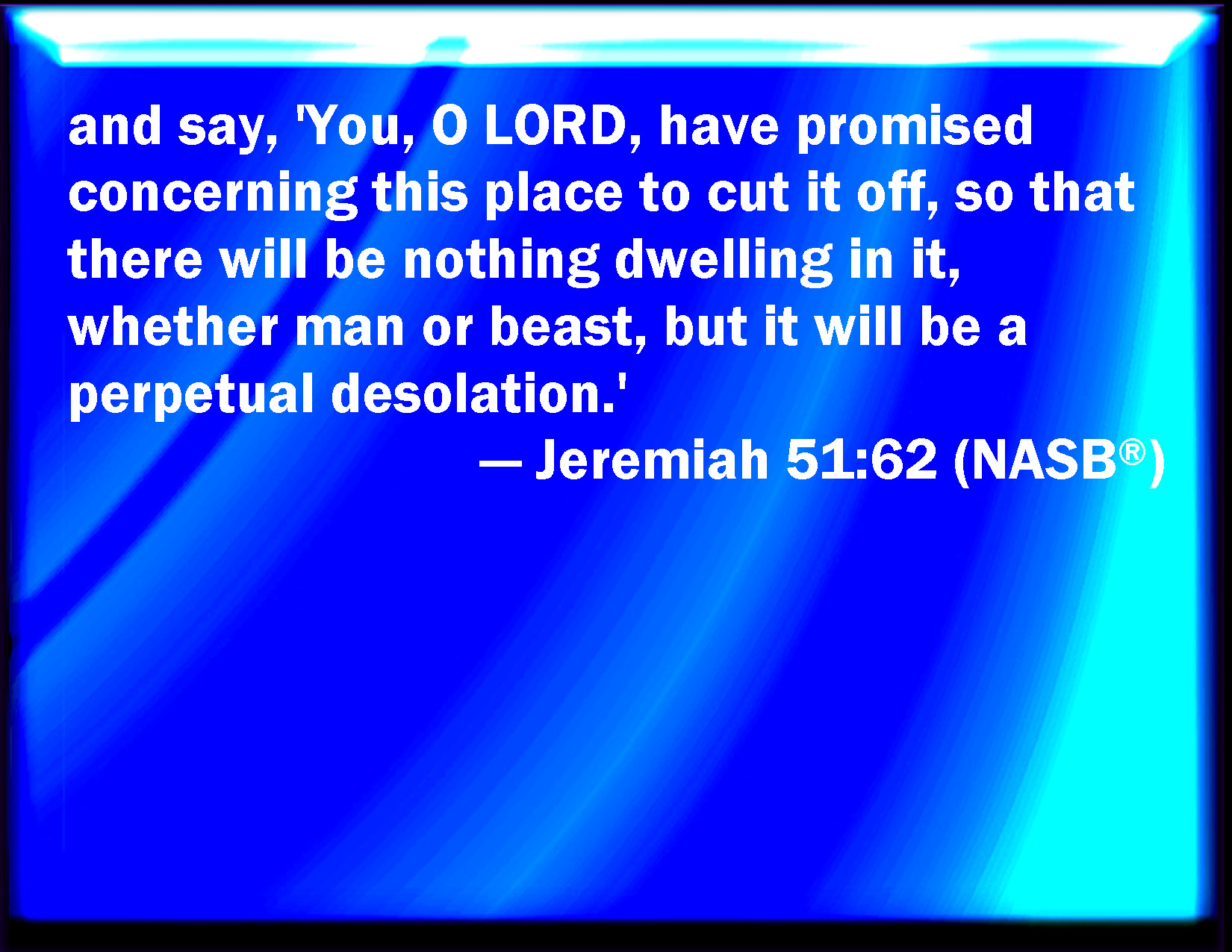 Bible Verse Slide Jeremiah 51:62 Then shall you say, O LORD, you have spoken against this place, to cut it off, that none shall remain in it, neither man nor beast, but that it shall be desolate for ever. KJV: Then shalt thou say, O LORD, thou hast spoken against this place, to cut it off, that none shall remain in it, neither man nor beast, but that it shall be desolate for ever. DRB: Thou shalt say: O Lord, thou hast spoken against this place to destroy it: so that there should be neither man nor beast to dwell therein, and that it should be desolate for ever. DBT: and say, Jehovah, thou hast spoken concerning this place, that thou wilt cut it off, so that none shall dwell in it, neither man nor beast, but that it shall be desolate for ever. ERV: and say, O LORD, thou hast spoken concerning this place, to cut it off, that none shall dwell therein, neither man nor beast, but that it shall be desolate for ever. WBT: Then shalt thou say, O LORD, thou hast spoken against this place, to cut it off, that none shall remain in it, neither man nor beast, but that it shall be desolate for ever. WEB: and say, Yahweh, you have spoken concerning this place, to cut it off, that none shall dwell therein, neither man nor animal, but that it shall be desolate forever. YLT: and hast said: Jehovah, Thou, Thou hast spoken concerning this place, to cut it off, that there is none dwelling in it, from man even unto cattle, for it is a desolation age-during.Links Jeremiah 51:62 NIV • Jeremiah 51:62 NLT • Jeremiah 51:62 ESV • Jeremiah 51:62 NASB • Jeremiah 51:62 KJV • Jeremiah 51:62 Interlinear • Jeremiah 51:62 Commentaries • Jeremiah 51:62 Parallel Texts • Jeremiah 51:62 Bible Apps • Jeremiah 51:62 Parallel • Bible Hub |