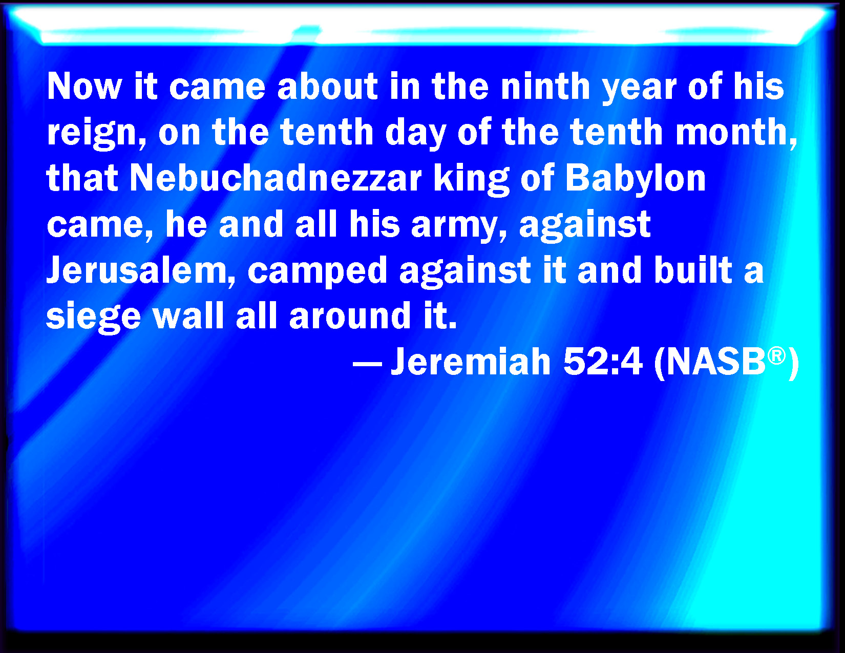 Bible Verse Slide Jeremiah 52:4 And it came to pass in the ninth year of his reign, in the tenth month, in the tenth day of the month, that Nebuchadrezzar king of Babylon came, he and all his army, against Jerusalem, and pitched against it, and built forts against it round about. KJV: And it came to pass in the ninth year of his reign, in the tenth month, in the tenth day of the month, that Nebuchadrezzar king of Babylon came, he and all his army, against Jerusalem, and pitched against it, and built forts against it round about. DRB: And it came to pass in the ninth year of his reign, in the tenth month, the tenth day of the month, that Nabuchodonosor the king of Babylon came, he and all his army, against Jerusalem, and they besieged it, and built forts against it round about. DBT: And it came to pass in the ninth year of his reign, in the tenth month, on the tenth of the month, that Nebuchadrezzar king of Babylon came, he and all his army, against Jerusalem; and they encamped against it, and built turrets against it round about. ERV: And it came to pass in the ninth year of his reign, in the tenth month, in the tenth day of the month, that Nebuchadrezzar king of Babylon came, he and all his army, against Jerusalem, and encamped against it; and they built forts against it round about. WBT: And it came to pass in the ninth year of his reign, in the tenth month, in the tenth day of the month, that Nebuchadrezzar king of Babylon came, he and all his army, against Jerusalem, and encamped against it, and built forts against it on every side. WEB: It happened in the ninth year of his reign, in the tenth month, in the tenth day of the month, that Nebuchadnezzar king of Babylon came, he and all his army, against Jerusalem, and encamped against it; and they built forts against it round about. YLT: And it cometh to pass, in the ninth year of his reign, in the tenth month, in the tenth of the month, come hath Nebuchadrezzar king of Babylon — he and all his force — against Jerusalem, and they encamp against it, and build against it a fortification round about;Links Jeremiah 52:4 NIV • Jeremiah 52:4 NLT • Jeremiah 52:4 ESV • Jeremiah 52:4 NASB • Jeremiah 52:4 KJV • Jeremiah 52:4 Interlinear • Jeremiah 52:4 Commentaries • Jeremiah 52:4 Parallel Texts • Jeremiah 52:4 Bible Apps • Jeremiah 52:4 Parallel • Bible Hub |