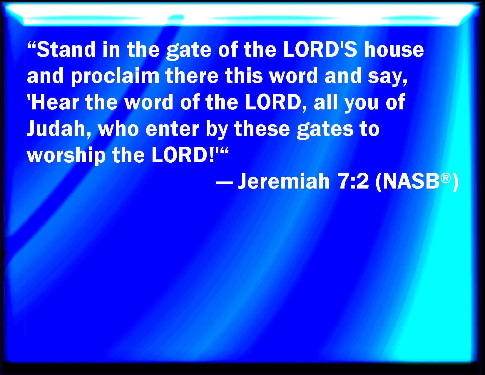 Bible Verse Slide Jeremiah 7:2 Stand in the gate of the LORD's house, and proclaim there this word, and say, Hear the word of the LORD, all you of Judah, that enter in at these gates to worship the LORD. KJV: Stand in the gate of the LORD'S house, and proclaim there this word, and say, Hear the word of the LORD, all ye of Judah, that enter in at these gates to worship the LORD. DRB: Stand in the gate of the house of the Lord, and proclaim there this word, and say: Hear ye the word of the Lord, all ye men of Juda, that enter in at these gates, to adore the Lord. DBT: Stand in the gate of Jehovah's house, and proclaim there this word, and say, Hear ye the word of Jehovah, all Judah, that enter in at these gates to worship Jehovah. ERV: Stand in the gate of the LORD'S house, and proclaim there this word, and say, Hear the word of the LORD, all ye of Judah, that enter in at these gates to worship the LORD. WBT: Stand in the gate of the LORD'S house, and proclaim there this word, and say, Hear the word of the LORD, all ye of Judah, that enter in at these gates to worship the LORD. WEB: "Stand in the gate of Yahweh's house, and proclaim there this word, and say, 'Hear the word of Yahweh, all you of Judah, who enter in at these gates to worship Yahweh. YLT: Stand in the gate of the house of Jehovah, and thou hast proclaimed there this word, and hast said, Hear a word of Jehovah, all ye of Judah, who are coming in at these gates, to bow before Jehovah:Links Jeremiah 7:2 NIV • Jeremiah 7:2 NLT • Jeremiah 7:2 ESV • Jeremiah 7:2 NASB • Jeremiah 7:2 KJV • Jeremiah 7:2 Interlinear • Jeremiah 7:2 Commentaries • Jeremiah 7:2 Parallel Texts • Jeremiah 7:2 Bible Apps • Jeremiah 7:2 Parallel • Bible Hub |