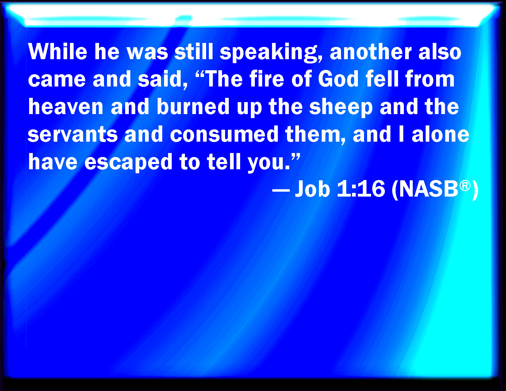 Bible Verse Slide Job 1:16 While he was yet speaking, there came also another, and said, The fire of God is fallen from heaven, and has burned up the sheep, and the servants, and consumed them; and I only am escaped alone to tell you. KJV: While he was yet speaking, there came also another, and said, The fire of God is fallen from heaven, and hath burned up the sheep, and the servants, and consumed them; and I only am escaped alone to tell thee. DRB: And while he was yet speaking, another came, and said: The fire of God fell from heaven, and striking the sheep and the servants, hath consumed them, and I alone have escaped to tell thee. DBT: While he was yet speaking, there came another and said, The fire of God fell from heaven and burned up the sheep and the servants, and consumed them; and I only am escaped, alone, to tell thee. ERV: While he was yet speaking, there came also another, and said, The fire of God is fallen from heaven, and hath burned up the sheep, and the servants, and consumed them; and I only am escaped alone to tell thee. WBT: While he was yet speaking, there came also another, and said, The fire of God hath fallen from heaven, and hath burned up the sheep and the servants, and consumed them; and I only have escaped alone to tell thee. WEB: While he was still speaking, there also came another, and said, "The fire of God has fallen from the sky, and has burned up the sheep and the servants, and consumed them, and I alone have escaped to tell you." YLT: While this one is speaking another also hath come and saith, 'Fire of God hath fallen from the heavens, and burneth among the flock, and among the young men, and consumeth them, and I am escaped — only I alone — to declare it to thee.'Links Job 1:16 NIV • Job 1:16 NLT • Job 1:16 ESV • Job 1:16 NASB • Job 1:16 KJV • Job 1:16 Interlinear • Job 1:16 Commentaries • Job 1:16 Parallel Texts • Job 1:16 Bible Apps • Job 1:16 Parallel • Bible Hub |