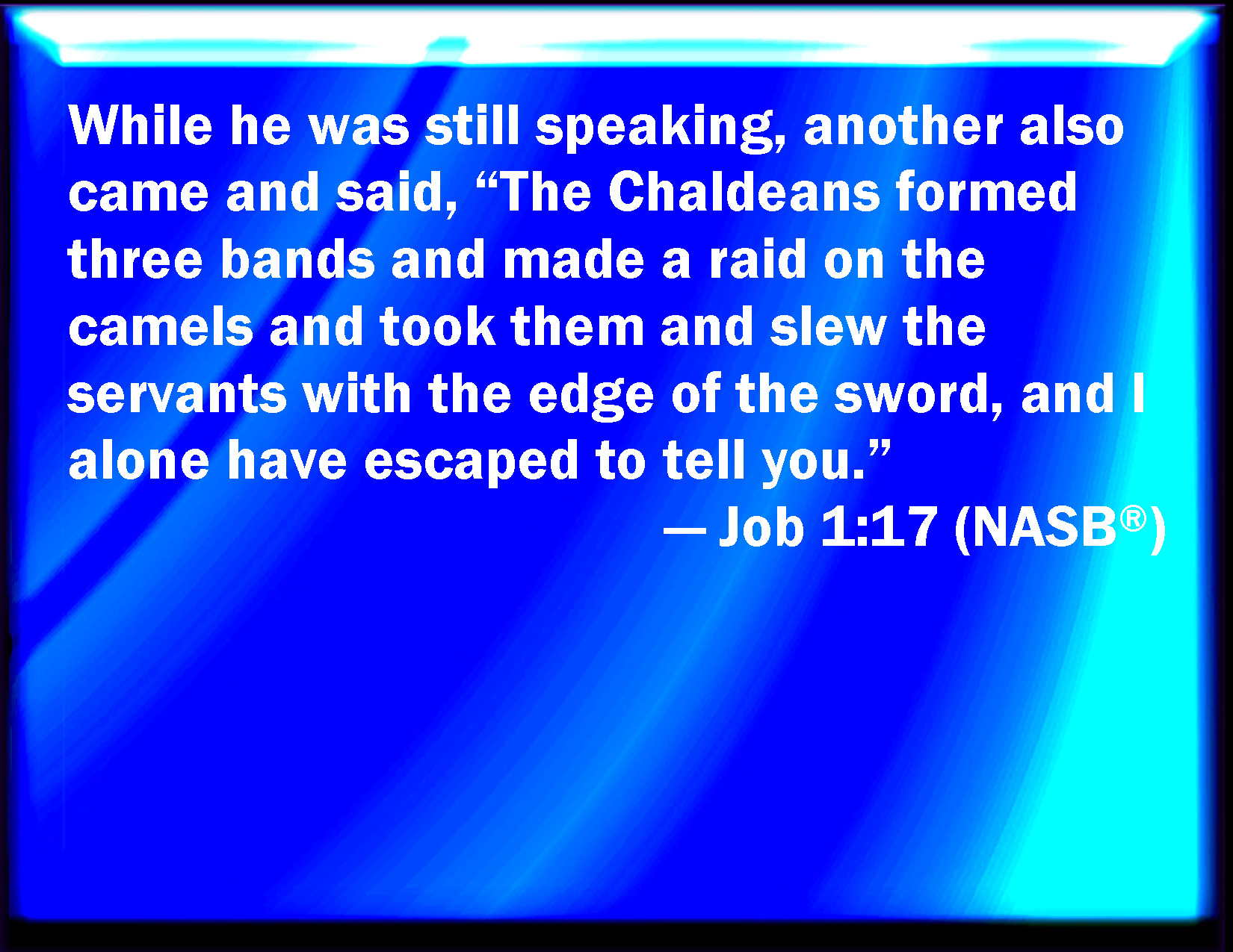Bible Verse Slide Job 1:17 While he was yet speaking, there came also another, and said, The Chaldeans made out three bands, and fell on the camels, and have carried them away, yes, and slain the servants with the edge of the sword; and I only am escaped alone to tell you. KJV: While he was yet speaking, there came also another, and said, The Chaldeans made out three bands, and fell upon the camels, and have carried them away, yea, and slain the servants with the edge of the sword; and I only am escaped alone to tell thee. DRB: And while he also was yet speaking, there came another, and said: The Chaldeans made three troops, and have fallen upon the camels, and taken them, moreover they have slain the servants with the sword, and I alone have escaped to tell thee. DBT: While he was yet speaking, there came another and said, The Chaldeans made three bands, and fell upon the camels and took them, and the servants have they smitten with the edge of the sword; and I only am escaped, alone, to tell thee. ERV: While he was yet speaking, there came also another, and said, The Chaldeans made three bands, and fell upon the camels, and have taken them away, yea, and slain the servants with the edge of the sword; and I only am escaped alone to tell thee. WBT: While he was yet speaking, there came also another, and said, The Chaldeans made three bands, and fell upon the camels, and have carried them away, yes, and slain the servants with the edge of the sword; and I only have escaped alone to tell thee. WEB: While he was still speaking, there came also another, and said, "The Chaldeans made three bands, and swept down on the camels, and have taken them away, yes, and killed the servants with the edge of the sword; and I alone have escaped to tell you." YLT: While this one is speaking another also hath come and saith, 'Chaldeans made three heads, and rush on the camels, and take them, and the young men they have smitten by the mouth of the sword, and I am escaped — only I alone — to declare it to thee.'Links Job 1:17 NIV • Job 1:17 NLT • Job 1:17 ESV • Job 1:17 NASB • Job 1:17 KJV • Job 1:17 Interlinear • Job 1:17 Commentaries • Job 1:17 Parallel Texts • Job 1:17 Bible Apps • Job 1:17 Parallel • Bible Hub |