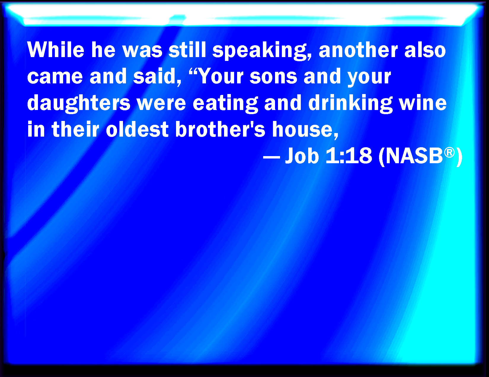 Bible Verse Slide Job 1:18 While he was yet speaking, there came also another, and said, Your sons and your daughters were eating and drinking wine in their oldest brother's house: KJV: While he was yet speaking, there came also another, and said, Thy sons and thy daughters were eating and drinking wine in their eldest brother's house: DRB: He was yet speaking, and behold another came in, and said: Thy sons and daughters were eating and drinking wine in the house of their elder brother: DBT: While he was yet speaking, there came another and said, Thy sons and thy daughters were eating and drinking wine in the house of their brother, the firstborn; ERV: While he was yet speaking, there came also another, and said, Thy sons and thy daughters were eating and drinking wine in their eldest brother's house: WBT: While he was yet speaking, there came also another, and said, Thy sons and thy daughters were eating and drinking wine in their eldest brother's house: WEB: While he was still speaking, there came also another, and said, "Your sons and your daughters were eating and drinking wine in their eldest brother's house, YLT: While this one is speaking another also hath come and saith, 'Thy sons and thy daughters are eating, and drinking wine, in the house of their brother, the first-born.Links Job 1:18 NIV • Job 1:18 NLT • Job 1:18 ESV • Job 1:18 NASB • Job 1:18 KJV • Job 1:18 Interlinear • Job 1:18 Commentaries • Job 1:18 Parallel Texts • Job 1:18 Bible Apps • Job 1:18 Parallel • Bible Hub |