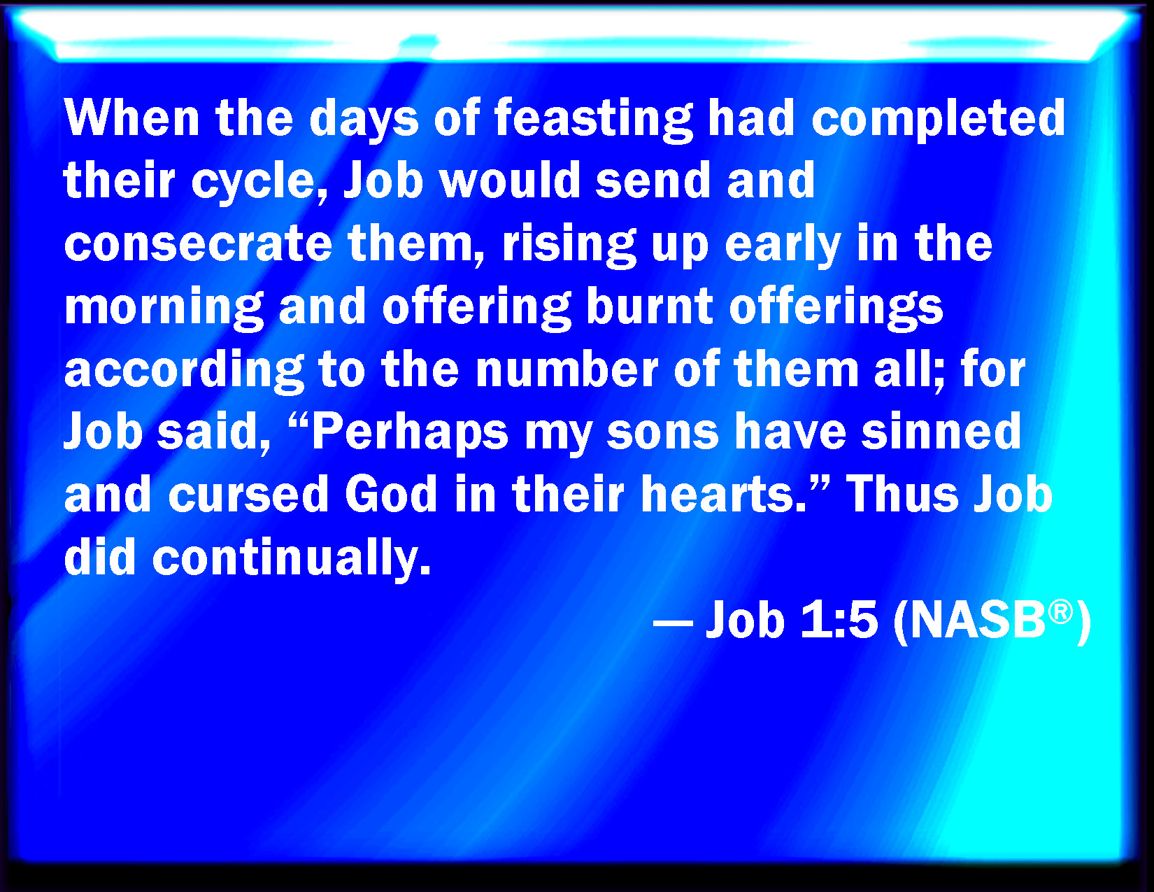 Bible Verse Slide Job 1:5 And it was so, when the days of their feasting were gone about, that Job sent and sanctified them, and rose up early in the morning, and offered burnt offerings according to the number of them all: for Job said, It may be that my sons have sinned, and cursed God in their hearts. Thus did Job continually. KJV: And it was so, when the days of their feasting were gone about, that Job sent and sanctified them, and rose up early in the morning, and offered burnt offerings according to the number of them all: for Job said, It may be that my sons have sinned, and cursed God in their hearts. Thus did Job continually. DRB: And when the days of their feasting were gone about, Job sent to them, and sanctified them: and rising up early offered holocausts for every one of them. For he said: Lest perhaps my sons have sinned, and have blessed God in their hearts. So did Job all days. DBT: And it was so, when the days of the feasting were gone about, that Job sent and hallowed them; and he rose up early in the morning, and offered up burnt-offerings according to the number of them all; for Job said, It may be that my children have sinned, and cursed God in their hearts. Thus did Job continually. ERV: And it was so, when the days of their feasting were gone about, that Job sent and sanctified them, and rose up early in the morning, and offered burn offerings according to the number of them all: for Job said, It may be that my sons have sinned, and renounced God in their hearts. Thus did Job continually. WBT: And it was so, when the days of their feasting were ended, that Job sent and sanctified them, and rose early in the morning, and offered burnt-offerings according to the number of them all; for Job said, It may be that my sons have sinned, and cursed God in their hearts. Thus did Job continually. WEB: It was so, when the days of their feasting had run their course, that Job sent and sanctified them, and rose up early in the morning, and offered burnt offerings according to the number of them all. For Job said, "It may be that my sons have sinned, and renounced God in their hearts." Job did so continually. YLT: and it cometh to pass, when they have gone round the days of the banquet, that Job doth send and sanctify them, and hath risen early in the morning, and caused to ascend burnt-offerings — the number of them all — for Job said, 'Perhaps my sons have sinned, yet blessed God in their heart.' Thus doth Job all the days.Links Job 1:5 NIV • Job 1:5 NLT • Job 1:5 ESV • Job 1:5 NASB • Job 1:5 KJV • Job 1:5 Interlinear • Job 1:5 Commentaries • Job 1:5 Parallel Texts • Job 1:5 Bible Apps • Job 1:5 Parallel • Bible Hub |