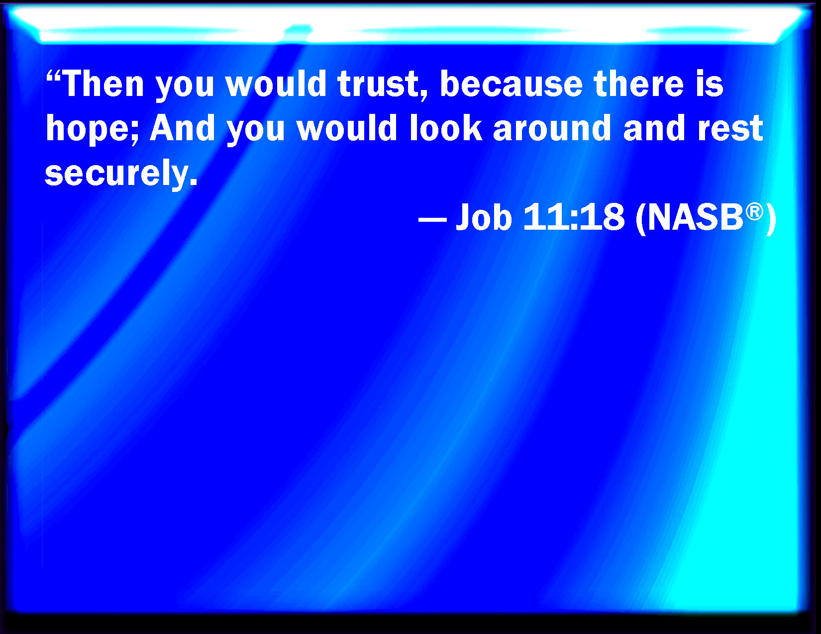Bible Verse Slide Job 11:18 And you shall be secure, because there is hope; yes, you shall dig about you, and you shall take your rest in safety. KJV: And thou shalt be secure, because there is hope; yea, thou shalt dig about thee, and thou shalt take thy rest in safety. DRB: And thou shalt have confidence, hope being set before thee, and being buried thou shalt sleep secure. DBT: And thou shalt have confidence, because there shall be hope; and having searched about thee, thou shalt take rest in safety. ERV: And thou shalt be secure, because there is hope; yea, thou shalt search about thee, and shalt take thy rest in safety. WBT: And thou shalt be secure, because there is hope; yes, thou shalt dig about thee, and thou shalt take thy rest in safety. WEB: You shall be secure, because there is hope. Yes, you shall search, and shall take your rest in safety. YLT: And thou hast trusted because their is hope, And searched — in confidence thou liest down,Links Job 11:18 NIV • Job 11:18 NLT • Job 11:18 ESV • Job 11:18 NASB • Job 11:18 KJV • Job 11:18 Interlinear • Job 11:18 Commentaries • Job 11:18 Parallel Texts • Job 11:18 Bible Apps • Job 11:18 Parallel • Bible Hub |