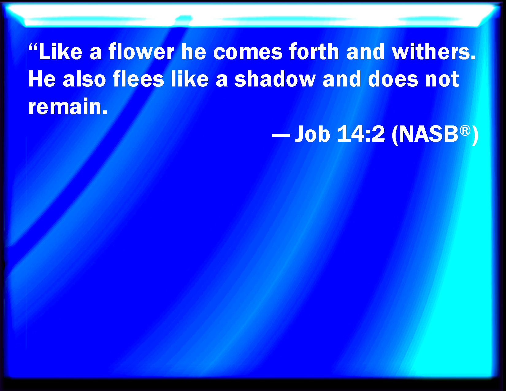 Bible Verse Slide Job 14:2 He comes forth like a flower, and is cut down: he flees also as a shadow, and continues not. KJV: He cometh forth like a flower, and is cut down: he fleeth also as a shadow, and continueth not. DRB: Who cometh forth like a flower, and is destroyed, and fleeth as a shadow, and never continueth in the same state. DBT: He cometh forth like a flower, and is cut down; and he fleeth as a shadow, and continueth not. ERV: He cometh forth like a flower, and is cut down: he fleeth also as a shadow, and continueth not. WBT: He cometh forth like a flower, and is cut down: he fleeth also as a shadow, and continueth not. WEB: He comes forth like a flower, and is cut down. He also flees like a shadow, and doesn't continue. YLT: As a flower he hath gone forth, and is cut off, And he fleeth as a shadow and standeth not.Links Job 14:2 NIV • Job 14:2 NLT • Job 14:2 ESV • Job 14:2 NASB • Job 14:2 KJV • Job 14:2 Interlinear • Job 14:2 Commentaries • Job 14:2 Parallel Texts • Job 14:2 Bible Apps • Job 14:2 Parallel • Bible Hub |