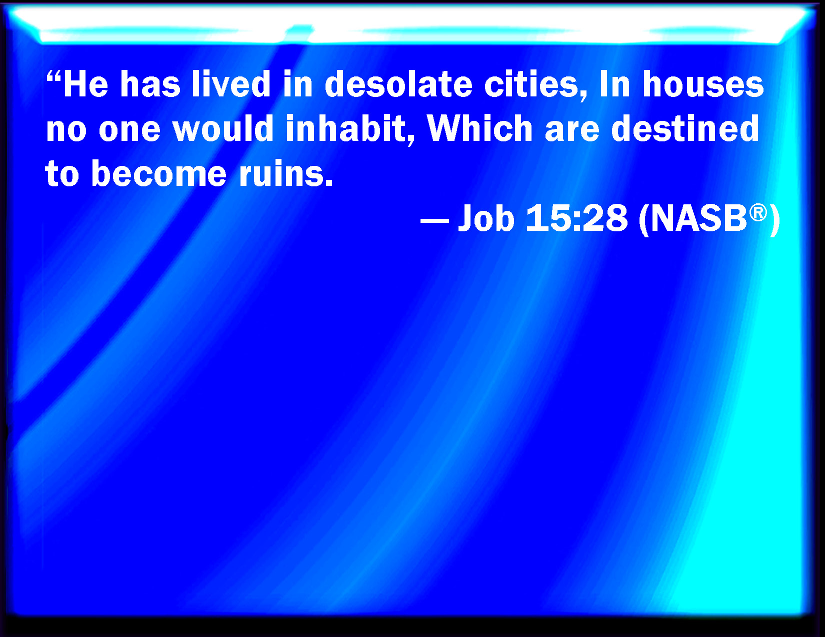 Bible Verse Slide Job 15:28 And he dwells in desolate cities, and in houses which no man inhabits, which are ready to become heaps. KJV: And he dwelleth in desolate cities, and in houses which no man inhabiteth, which are ready to become heaps. DRB: He hath dwelt in desolate cities, and in desert houses that are reduced into heaps. DBT: And he dwelleth in desolate cities, in houses that no man inhabiteth, which are destined to become heaps. ERV: And he hath dwelt in desolate cities, in houses which no man inhabited, which were ready to become heaps. WBT: And he dwelleth in desolate cities, and in houses which no man inhabiteth, which are ready to become heaps. WEB: He has lived in desolate cities, in houses which no one inhabited, which were ready to become heaps. YLT: And he inhabiteth cities cut off, houses not dwelt in, That have been ready to become heaps.Links Job 15:28 NIV • Job 15:28 NLT • Job 15:28 ESV • Job 15:28 NASB • Job 15:28 KJV • Job 15:28 Interlinear • Job 15:28 Commentaries • Job 15:28 Parallel Texts • Job 15:28 Bible Apps • Job 15:28 Parallel • Bible Hub |