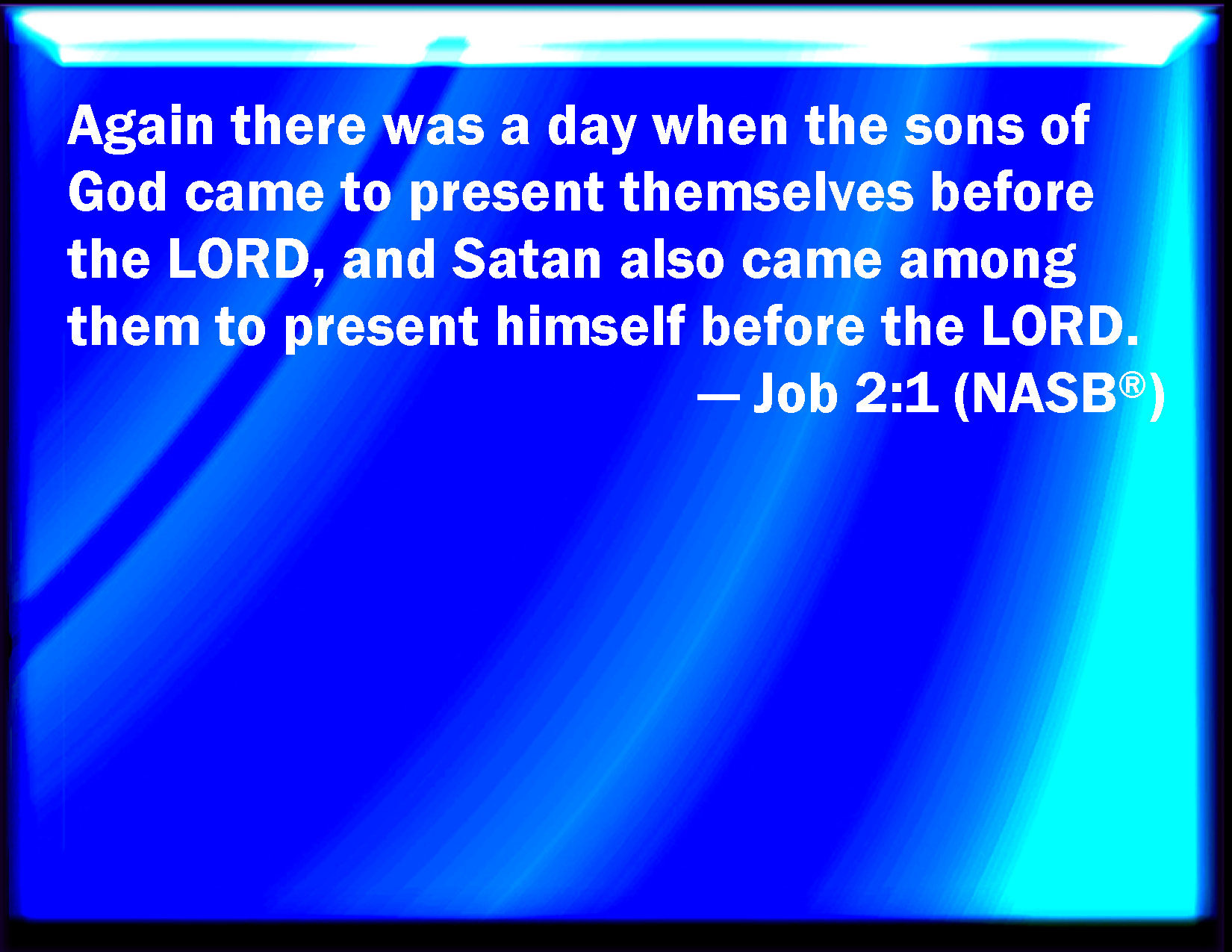 Bible Verse Slide Job 2:1 Again there was a day when the sons of God came to present themselves before the LORD, and Satan came also among them to present himself before the LORD. KJV: Again there was a day when the sons of God came to present themselves before the LORD, and Satan came also among them to present himself before the LORD. DRB: And it came to pass, when on a certain day the sons of God came, and stood before the Lord, and Satan came among them, and stood in his sight, DBT: And there was a day when the sons of God came to present themselves before Jehovah, and Satan also came among them to present himself before Jehovah. ERV: Again there was a day when the sons of God came to present themselves before the LORD, and Satan came also among them to present himself before the LORD. WBT: Again there was a day when the sons of God came to present themselves before the LORD, and Satan came also among them to present himself before the LORD. WEB: Again it happened on the day when the God's sons came to present themselves before Yahweh, that Satan came also among them to present himself before Yahweh. YLT: And the day is, that sons of God come in to station themselves by Jehovah, and there doth come also the Adversary in their midst to station himself by Jehovah.Links Job 2:1 NIV • Job 2:1 NLT • Job 2:1 ESV • Job 2:1 NASB • Job 2:1 KJV • Job 2:1 Interlinear • Job 2:1 Commentaries • Job 2:1 Parallel Texts • Job 2:1 Bible Apps • Job 2:1 Parallel • Bible Hub |