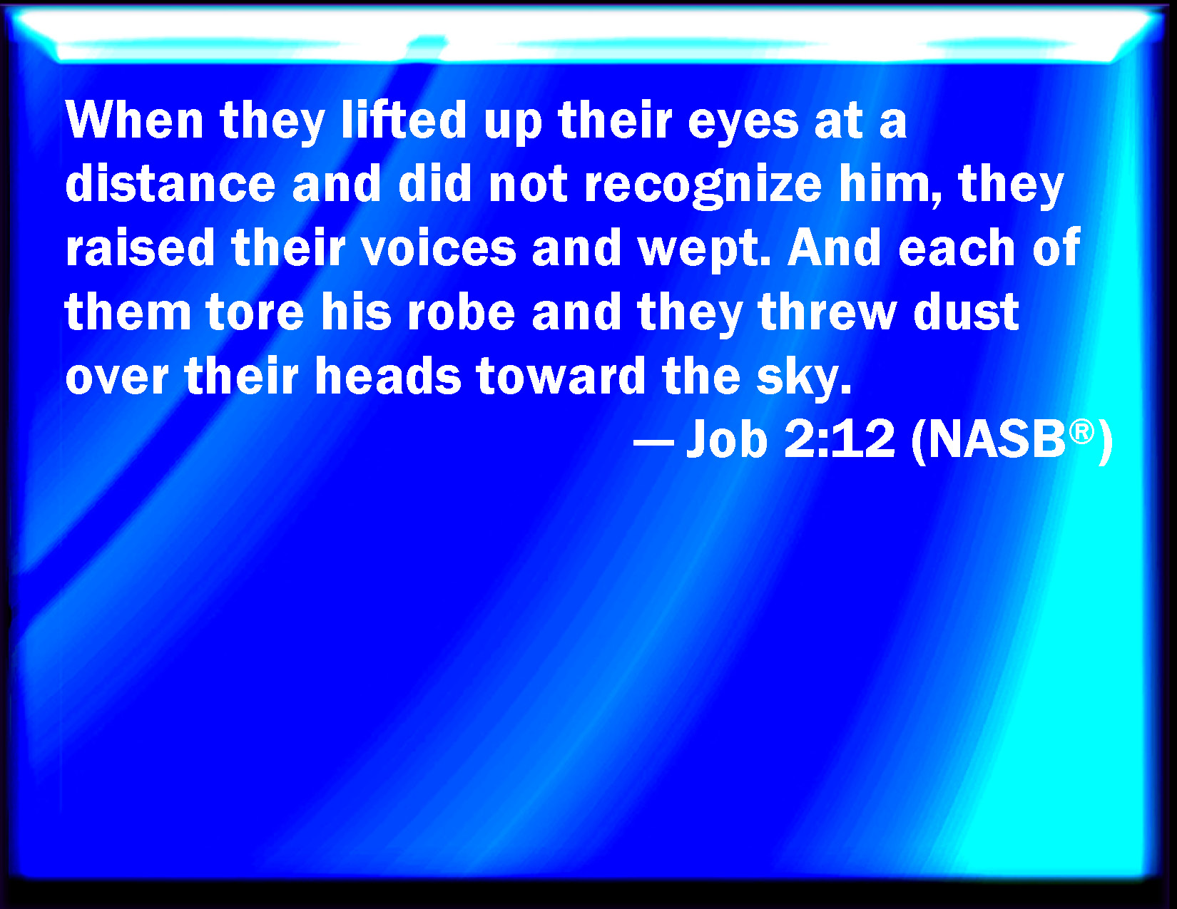 Bible Verse Slide Job 2:12 And when they lifted up their eyes afar off, and knew him not, they lifted up their voice, and wept; and they rent every one his mantle, and sprinkled dust on their heads toward heaven. KJV: And when they lifted up their eyes afar off, and knew him not, they lifted up their voice, and wept; and they rent every one his mantle, and sprinkled dust upon their heads toward heaven. DRB: And when they had lifted up their eyes afar off, they knew him not, and crying out they wept, and rending their garments they sprinkled dust upon their heads towards heaven. DBT: And when they lifted up their eyes afar off, and knew him not, they lifted up their voice and wept. And they rent every one his mantle, and sprinkled dust upon their heads toward the heavens. ERV: And when they lifted up their eyes afar off, and knew him not, they lifted up their voice, and wept; and they rent every one his mantle, and sprinkled dust upon their heads toward heaven. WBT: And when they lifted up their eyes afar off, and knew him not, they raised their voice, and wept; and they rent every one his mantle, and sprinkled dust upon their heads towards heaven. WEB: When they lifted up their eyes from a distance, and didn't recognize him, they raised their voices, and wept; and they each tore his robe, and sprinkled dust on their heads toward the sky. YLT: and they lift up their eyes from afar and have not discerned him, and they lift up their voice and weep, and rend each his robe, and sprinkle dust on their heads — heavenward.Links Job 2:12 NIV • Job 2:12 NLT • Job 2:12 ESV • Job 2:12 NASB • Job 2:12 KJV • Job 2:12 Interlinear • Job 2:12 Commentaries • Job 2:12 Parallel Texts • Job 2:12 Bible Apps • Job 2:12 Parallel • Bible Hub |