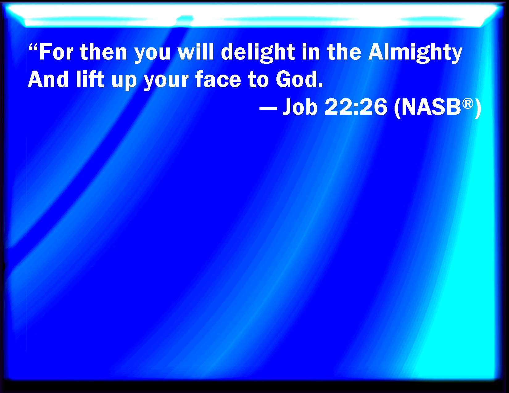 Bible Verse Slide Job 22:26 For then shall you have your delight in the Almighty, and shall lift up your face to God. KJV: For then shalt thou have thy delight in the Almighty, and shalt lift up thy face unto God. DRB: Then shalt thou abound in delights in the Almighty, and shalt lift up thy face to God. DBT: Yea, then shalt thou delight thyself in the Almighty, and shalt lift up thy face unto +God: ERV: For then shalt thou delight thyself in the Almighty, and shalt lift up thy face unto God. WBT: For then shalt thou have thy delight in the Almighty, and shalt lift up thy face to God. WEB: For then you will delight yourself in the Almighty, and shall lift up your face to God. YLT: For then on the Mighty thou delightest thyself, And dost lift up unto God thy face,Links Job 22:26 NIV • Job 22:26 NLT • Job 22:26 ESV • Job 22:26 NASB • Job 22:26 KJV • Job 22:26 Interlinear • Job 22:26 Commentaries • Job 22:26 Parallel Texts • Job 22:26 Bible Apps • Job 22:26 Parallel • Bible Hub |