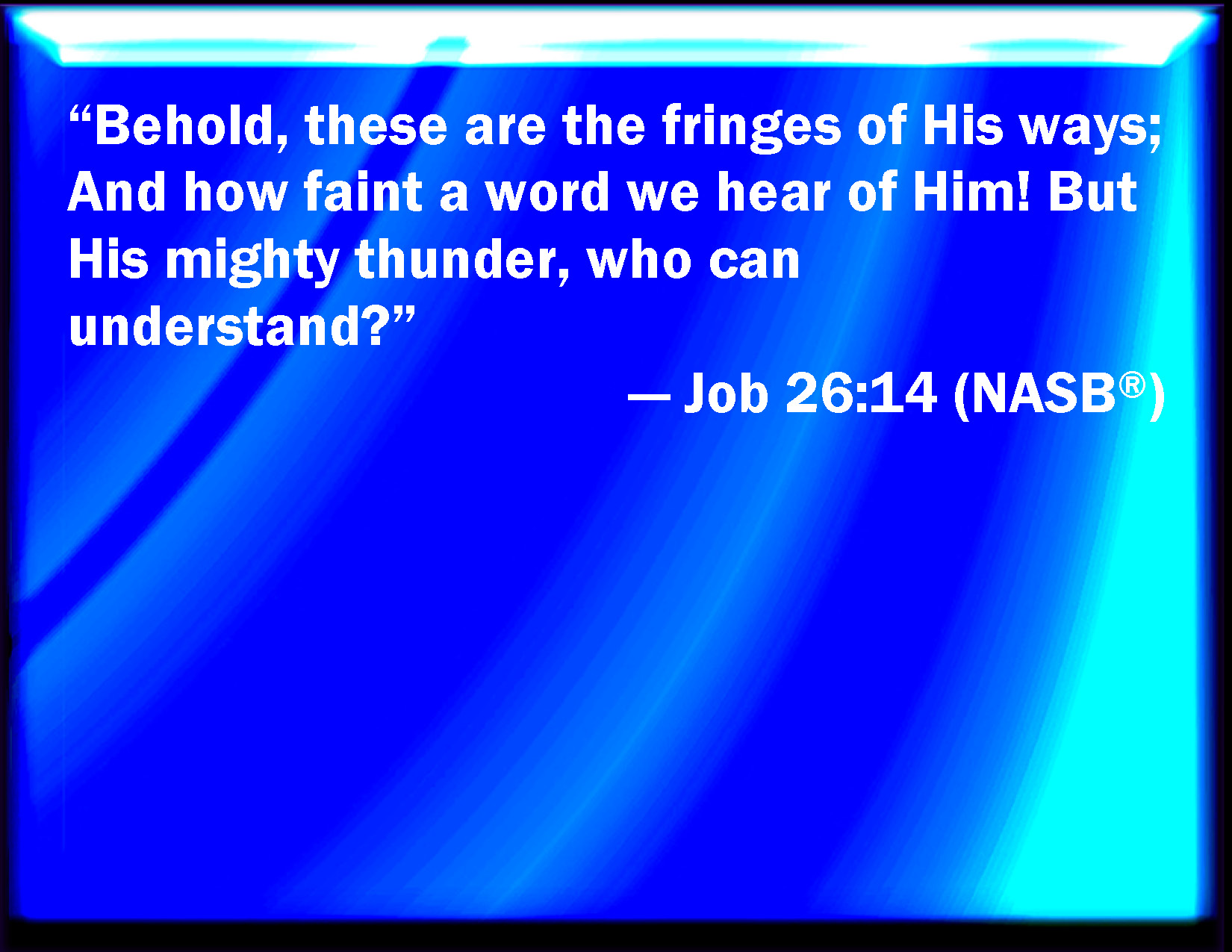 Bible Verse Slide Job 26:14 See, these are parts of his ways: but how little a portion is heard of him? but the thunder of his power who can understand? KJV: Lo, these are parts of his ways: but how little a portion is heard of him? but the thunder of his power who can understand? DRB: Lo, these things are said in part of his ways: and seeing we have heard scarce a little drop of his word, who shall be able to behold the thunder of his greatness? DBT: Lo, these are the borders of his ways; but what a whisper of a word do we hear of him! And the thunder of his power, who can understand? ERV: Lo, these are but the outskirts of his ways: and how small a whisper do we hear of him! but the thunder of his power who can understand? WBT: Lo, these are parts of his ways: but how little a portion is heard of him? but the thunder of his power who can understand? WEB: Behold, these are but the outskirts of his ways. How small a whisper do we hear of him! But the thunder of his power who can understand?" YLT: Lo, these are the borders of His way, And how little a matter is heard of Him, And the thunder of His might Who doth understand?Links Job 26:14 NIV • Job 26:14 NLT • Job 26:14 ESV • Job 26:14 NASB • Job 26:14 KJV • Job 26:14 Interlinear • Job 26:14 Commentaries • Job 26:14 Parallel Texts • Job 26:14 Bible Apps • Job 26:14 Parallel • Bible Hub |