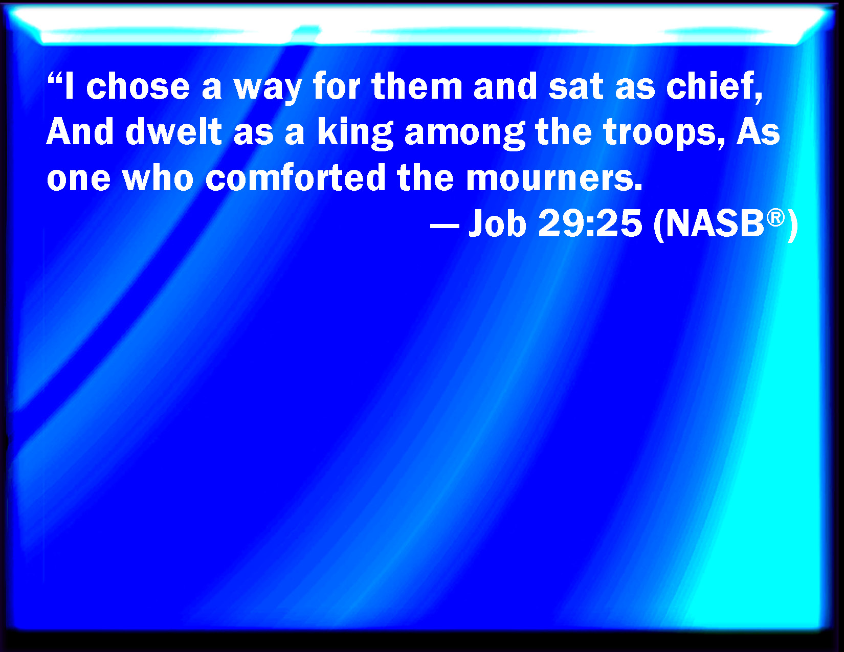 Bible Verse Slide Job 29:25 I chose out their way, and sat chief, and dwelled as a king in the army, as one that comforts the mourners. KJV: I chose out their way, and sat chief, and dwelt as a king in the army, as one that comforteth the mourners. DRB: If I had a mind to go to them, I sat first, and when I sat as a king, with his army standing about him, yet I was a comforter of them that mourned. DBT: I chose their way, and sat as chief, and dwelt as a king in the army, as one that comforteth mourners. ERV: I chose out their way, and sat as chief, and dwelt as a king in the army, as one that comforteth the mourners. WBT: I chose out their way, and sat chief, and dwelt as a king in the army, as one that comforteth the mourners. WEB: I chose out their way, and sat as chief. I lived as a king in the army, as one who comforts the mourners. YLT: I choose their way, and sit head, And I dwell as a king in a troop, When mourners he doth comfort.Links Job 29:25 NIV • Job 29:25 NLT • Job 29:25 ESV • Job 29:25 NASB • Job 29:25 KJV • Job 29:25 Interlinear • Job 29:25 Commentaries • Job 29:25 Parallel Texts • Job 29:25 Bible Apps • Job 29:25 Parallel • Bible Hub |