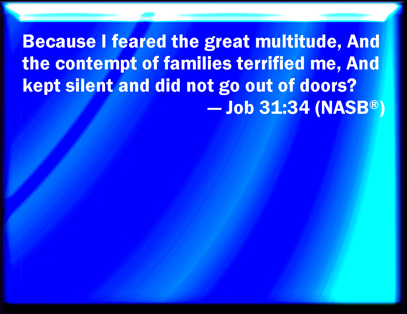 Bible Verse Slide Job 31:34 Did I fear a great multitude, or did the contempt of families terrify me, that I kept silence, and went not out of the door? KJV: Did I fear a great multitude, or did the contempt of families terrify me, that I kept silence, and went not out of the door? DRB: If I have been afraid at a very great multitude, and the contempt of kinsmen hath terrified me: and I have not rather held my peace, and not gone out of the door. DBT: Because I feared the great multitude, and the contempt of families terrified me, so that I kept silence, and went not out of the door, ... ERV: Because I feared the great multitude, and the contempt of families terrified me, so that I kept silence, and went not out of the door— WBT: Did I fear a great multitude, or did the contempt of families terrify me, that I kept silence, and went not out of the door? WEB: because I feared the great multitude, and the contempt of families terrified me, so that I kept silence, and didn't go out of the door— YLT: Because I fear a great multitude, And the contempt of families doth affright me, Then I am silent, I go not out of the opening.Links Job 31:34 NIV • Job 31:34 NLT • Job 31:34 ESV • Job 31:34 NASB • Job 31:34 KJV • Job 31:34 Interlinear • Job 31:34 Commentaries • Job 31:34 Parallel Texts • Job 31:34 Bible Apps • Job 31:34 Parallel • Bible Hub |