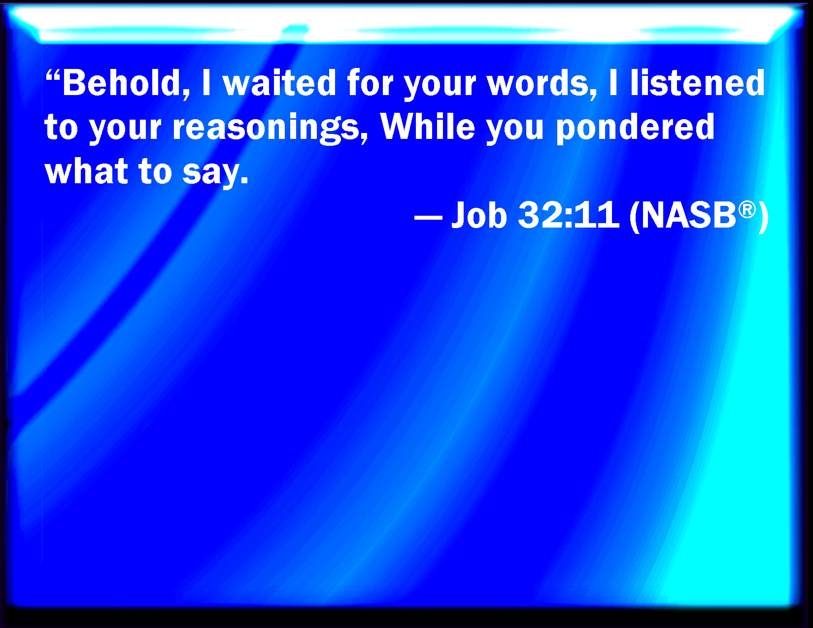 Bible Verse Slide Job 32:11 Behold, I waited for your words; I gave ear to your reasons, whilst you searched out what to say. KJV: Behold, I waited for your words; I gave ear to your reasons, whilst ye searched out what to say. DRB: For I have waited for your words, I have given ear to your wisdom, as long as you were disputing in words. DBT: Lo, I waited for your words; I gave ear to your reasonings, until ye searched out what to say. ERV: Behold, I waited for your words, I listened for your reasons, whilst ye searched out what to say. WBT: Behold, I waited for your words; I gave ear to your reasons, whilst ye searched out what to say. WEB: "Behold, I waited for your words, and I listened for your reasoning, while you searched out what to say. YLT: Lo, I have waited for your words, I give ear unto your reasons, Till ye search out sayings.Links Job 32:11 NIV • Job 32:11 NLT • Job 32:11 ESV • Job 32:11 NASB • Job 32:11 KJV • Job 32:11 Interlinear • Job 32:11 Commentaries • Job 32:11 Parallel Texts • Job 32:11 Bible Apps • Job 32:11 Parallel • Bible Hub |