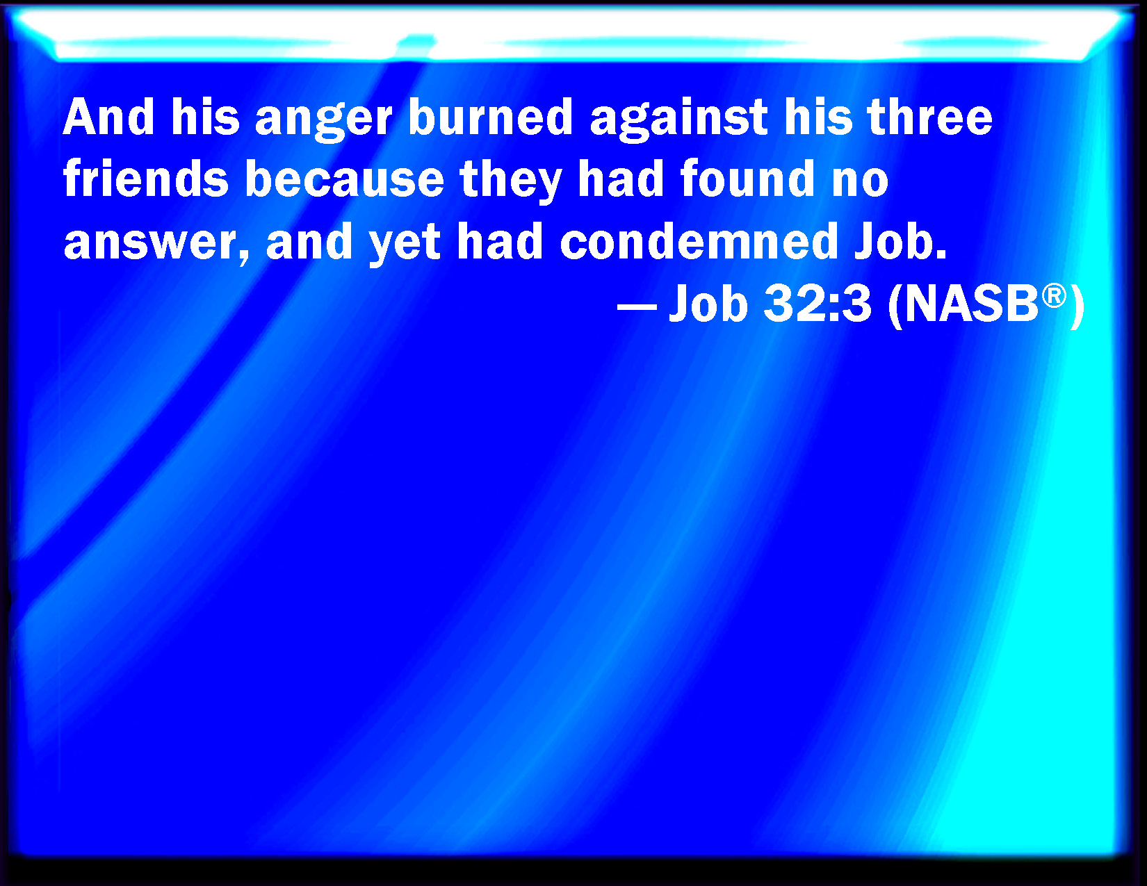 Bible Verse Slide Job 32:3 Also against his three friends was his wrath kindled, because they had found no answer, and yet had condemned Job. KJV: Also against his three friends was his wrath kindled, because they had found no answer, and yet had condemned Job. DRB: And he was angry with his friends because they had not found a reasonable answer, but only had condemned Job. DBT: and against his three friends was his anger kindled, because they found no answer, and yet condemned Job. ERV: Also against his three friends was his wrath kindled, because they had found no answer, and yet had condemned Job. WBT: Also against his three friends was his wrath kindled, because they had found no answer, and yet had condemned Job. WEB: Also his wrath was kindled against his three friends, because they had found no answer, and yet had condemned Job. YLT: and against his three friends hath his anger burned, because that they have not found an answer, and condemn Job.Links Job 32:3 NIV • Job 32:3 NLT • Job 32:3 ESV • Job 32:3 NASB • Job 32:3 KJV • Job 32:3 Interlinear • Job 32:3 Commentaries • Job 32:3 Parallel Texts • Job 32:3 Bible Apps • Job 32:3 Parallel • Bible Hub |