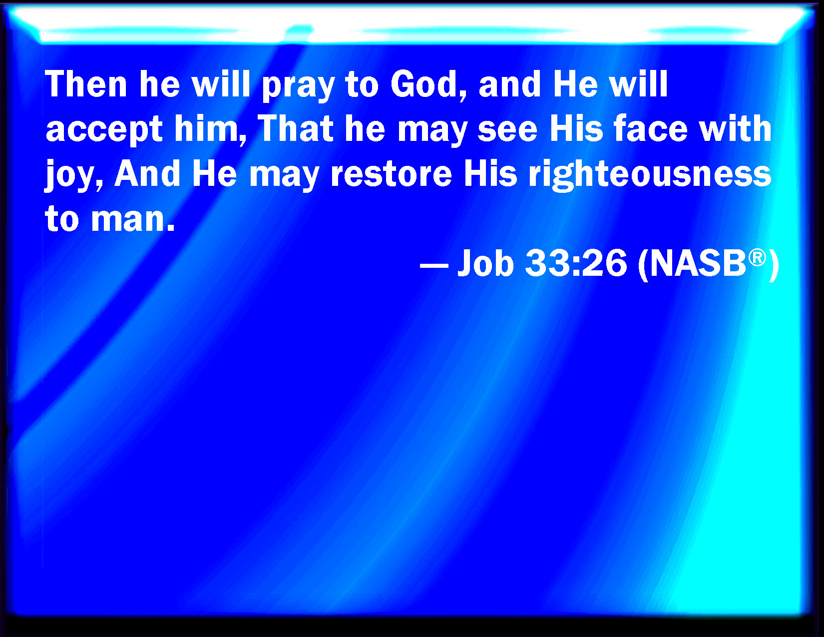 Bible Verse Slide Job 33:26 He shall pray to God, and he will be favorable to him: and he shall see his face with joy: for he will render to man his righteousness. KJV: He shall pray unto God, and he will be favourable unto him: and he shall see his face with joy: for he will render unto man his righteousness. DRB: He shall pray to God, and he will be gracious to him : and he shall see his face with joy, and he will render to man his justice. DBT: He shall pray unto +God, and he will receive him with favour; and he shall see his face with shoutings, and he will render unto man his righteousness. ERV: He prayeth unto God, and he is favourable unto him; so that he seeth his face with joy: and he restoreth unto man his righteousness. WBT: He shall pray to God, and he will be favorable to him: and he shall see his face with joy: for he will render to man his righteousness. WEB: He prays to God, and he is favorable to him, so that he sees his face with joy. He restores to man his righteousness. YLT: He maketh supplication unto God, And He accepteth him. And he seeth His face with shouting, And He returneth to man His righteousness.Links Job 33:26 NIV • Job 33:26 NLT • Job 33:26 ESV • Job 33:26 NASB • Job 33:26 KJV • Job 33:26 Interlinear • Job 33:26 Commentaries • Job 33:26 Parallel Texts • Job 33:26 Bible Apps • Job 33:26 Parallel • Bible Hub |