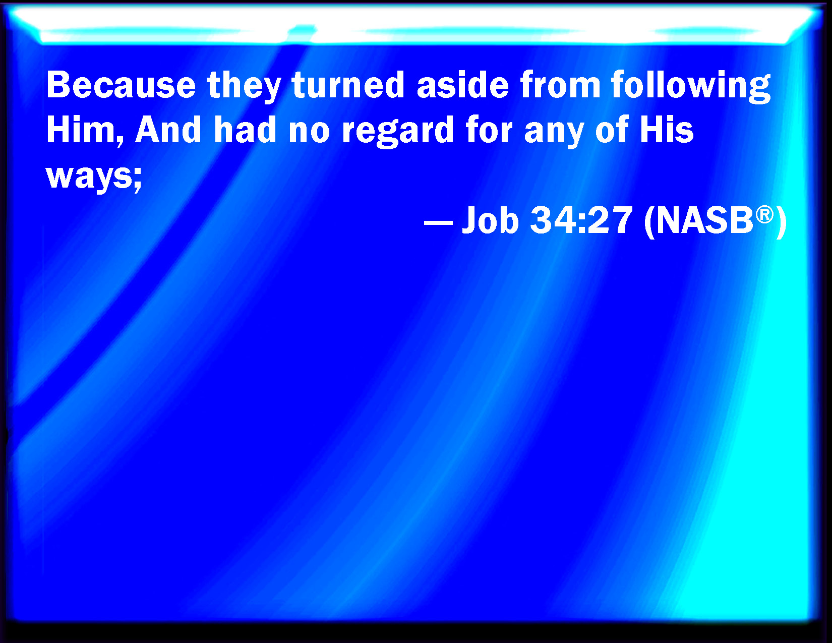 Bible Verse Slide Job 34:27 Because they turned back from him, and would not consider any of his ways: KJV: Because they turned back from him, and would not consider any of his ways: DRB: Who as it were on purpose have revolted from him, and would not understand all his ways : DBT: Because they have turned back from him, and would consider none of his ways; ERV: Because they turned aside from following him, and would not have regard to any of his ways: WBT: Because they turned back from him, and would not consider any of his ways: WEB: because they turned aside from following him, and wouldn't pay attention to any of his ways, YLT: Because that against right They have turned aside from after Him, And none of His ways have considered wisely,Links Job 34:27 NIV • Job 34:27 NLT • Job 34:27 ESV • Job 34:27 NASB • Job 34:27 KJV • Job 34:27 Interlinear • Job 34:27 Commentaries • Job 34:27 Parallel Texts • Job 34:27 Bible Apps • Job 34:27 Parallel • Bible Hub |