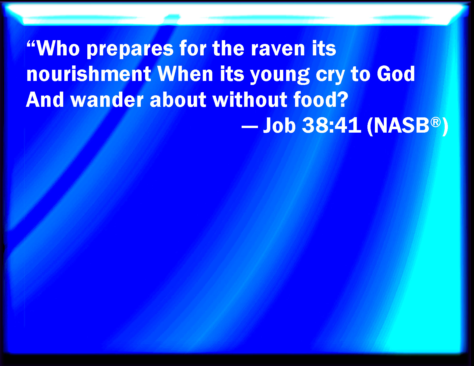 Bible Verse Slide Job 38:41 Who provides for the raven his food? when his young ones cry to God, they wander for lack of meat. KJV: Who provideth for the raven his food? when his young ones cry unto God, they wander for lack of meat. DRB: Who provideth food for the raven, when her young ones cry to God, wandering about, because they have no meat? DBT: Who provideth for the raven his food, when his young ones cry unto God, and they wander for lack of meat? ERV: Who provideth for the raven his food, when his young ones cry unto God, and wander for lack of meat? WBT: Who provideth for the raven his food? when his young ones cry to God, they wander for want of food. WEB: Who provides for the raven his prey, when his young ones cry to God, and wander for lack of food? YLT: Who doth prepare for a raven his provision, When his young ones cry unto God? They wander without food.Links Job 38:41 NIV • Job 38:41 NLT • Job 38:41 ESV • Job 38:41 NASB • Job 38:41 KJV • Job 38:41 Interlinear • Job 38:41 Commentaries • Job 38:41 Parallel Texts • Job 38:41 Bible Apps • Job 38:41 Parallel • Bible Hub |