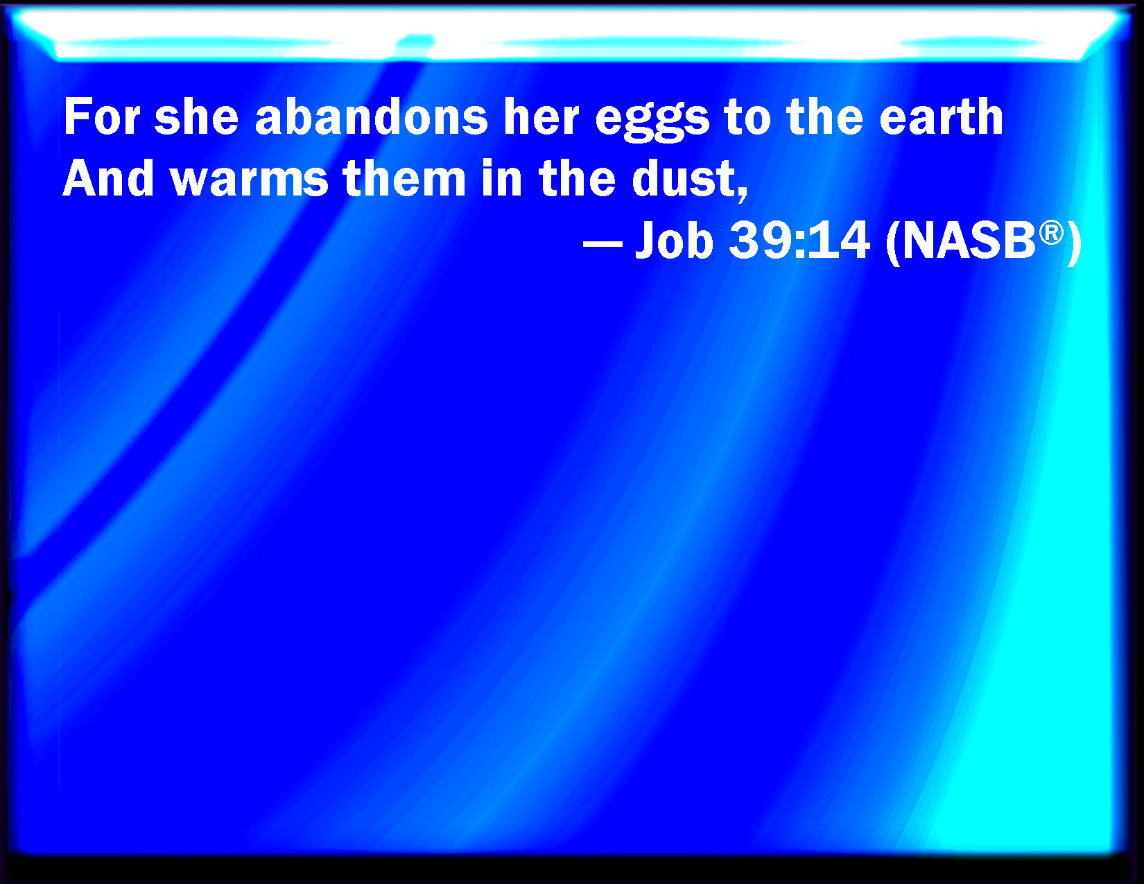 Bible Verse Slide Job 39:14 Which leaves her eggs in the earth, and warms them in dust, KJV: Which leaveth her eggs in the earth, and warmeth them in dust, DRB: When she leaveth her eggs on the earth, thou perhaps wilt warm them in the dust. DBT: For she leaveth her eggs to the earth, and warmeth them in the dust, ERV: For she leaveth her eggs on the earth, and warmeth them in the dust, WBT: Which leaveth her eggs in the earth, and warmeth them in the dust, WEB: For she leaves her eggs on the earth, warms them in the dust, YLT: For she leaveth on the earth her eggs, And on the dust she doth warm them,Links Job 39:14 NIV • Job 39:14 NLT • Job 39:14 ESV • Job 39:14 NASB • Job 39:14 KJV • Job 39:14 Interlinear • Job 39:14 Commentaries • Job 39:14 Parallel Texts • Job 39:14 Bible Apps • Job 39:14 Parallel • Bible Hub |