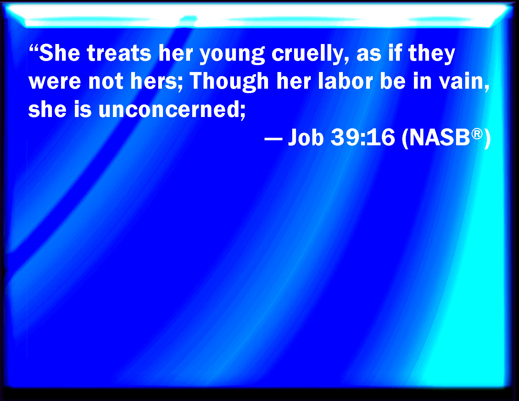 Bible Verse Slide Job 39:16 She is hardened against her young ones, as though they were not her's: her labor is in vain without fear; KJV: She is hardened against her young ones, as though they were not hers: her labour is in vain without fear; DRB: She is hardened against her young ones, as though they were not hers, she hath laboured in vain, no fear constraining her. DBT: She is hardened against her young ones, as though they were not hers; her labour is in vain, without her concern. ERV: She is hardened against her young ones, as if they were not hers: though her labour be in vain, she is without fear; WBT: She is hardened against her young ones, as though they were not hers: her labor is in vain without fear; WEB: She deals harshly with her young ones, as if they were not hers. Though her labor is in vain, she is without fear, YLT: Her young ones it hath hardened without her, In vain is her labour without fear.Links Job 39:16 NIV • Job 39:16 NLT • Job 39:16 ESV • Job 39:16 NASB • Job 39:16 KJV • Job 39:16 Interlinear • Job 39:16 Commentaries • Job 39:16 Parallel Texts • Job 39:16 Bible Apps • Job 39:16 Parallel • Bible Hub |