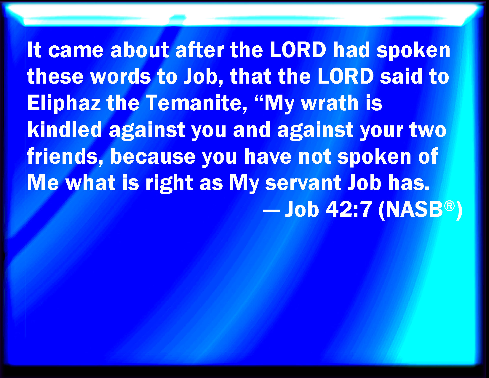 Bible Verse Slide Job 42:7 And it was so, that after the LORD had spoken these words to Job, the LORD said to Eliphaz the Temanite, My wrath is kindled against you, and against your two friends: for you have not spoken of me the thing that is right, as my servant Job has. KJV: And it was so, that after the LORD had spoken these words unto Job, the LORD said to Eliphaz the Temanite, My wrath is kindled against thee, and against thy two friends: for ye have not spoken of me the thing that is right, as my servant Job hath. DRB: And after the Lord had spoken these words to Job, he said to Eliphaz the Themanite : My wrath is kindled against thee, and against thy two friends, because you have not spoken the thing that is right before my, as my servant Job hath. DBT: And it came to pass after Jehovah had spoken these words to Job, that Jehovah said to Eliphaz the Temanite, Mine anger is kindled against thee, and against thy two friends; for ye have not spoken rightly of me, like my servant Job. ERV: And it was so, that after the LORD had spoken these words unto Job, the LORD said to Eliphaz the Temanite, My wrath is kindled against thee, and against thy two friends: for ye have not spoken of me the thing that is right, as my servant Job hath. WBT: And it was so, that after the LORD had spoken these words to Job, the LORD said to Eliphaz the Temanite, My wrath is kindled against thee, and against thy two friends: for ye have not spoken of me the thing that is right, as my servant Job hath. WEB: It was so, that after Yahweh had spoken these words to Job, Yahweh said to Eliphaz the Temanite, "My wrath is kindled against you, and against your two friends; for you have not spoken of me the thing that is right, as my servant Job has. YLT: And it cometh to pass after Jehovah's speaking these words unto Job, that Jehovah saith unto Eliphaz the Temanite, 'Burned hath Mine anger against thee, and against thy two friends, because ye have not spoken concerning Me rightly, like My servant Job.Links Job 42:7 NIV • Job 42:7 NLT • Job 42:7 ESV • Job 42:7 NASB • Job 42:7 KJV • Job 42:7 Interlinear • Job 42:7 Commentaries • Job 42:7 Parallel Texts • Job 42:7 Bible Apps • Job 42:7 Parallel • Bible Hub |