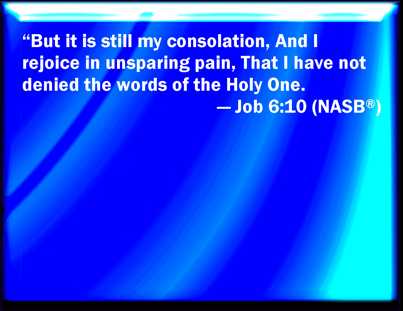 Bible Verse Slide Job 6:10 Then should I yet have comfort; yes, I would harden myself in sorrow: let him not spare; for I have not concealed the words of the Holy One. KJV: Then should I yet have comfort; yea, I would harden myself in sorrow: let him not spare; for I have not concealed the words of the Holy One. DRB: And that this may be my comfort, that afflicting me with sorrow, he spare not, nor I contradict the words of the Holy One. DBT: Then should I yet have comfort; and in the pain which spareth not I would rejoice that I have not denied the words of the Holy One. ERV: Then should I yet have comfort; yea, I would exult in pain that spareth not: for I have not denied the words of the Holy One. WBT: Then should I yet have comfort; yes, I would harden myself in sorrow: let him not spare; for I have not concealed the words of the Holy One. WEB: Be it still my consolation, yes, let me exult in pain that doesn't spare, that I have not denied the words of the Holy One. YLT: And yet it is my comfort, (And I exult in pain — He doth not spare,) That I have not hidden The sayings of the Holy One.Links Job 6:10 NIV • Job 6:10 NLT • Job 6:10 ESV • Job 6:10 NASB • Job 6:10 KJV • Job 6:10 Interlinear • Job 6:10 Commentaries • Job 6:10 Parallel Texts • Job 6:10 Bible Apps • Job 6:10 Parallel • Bible Hub |