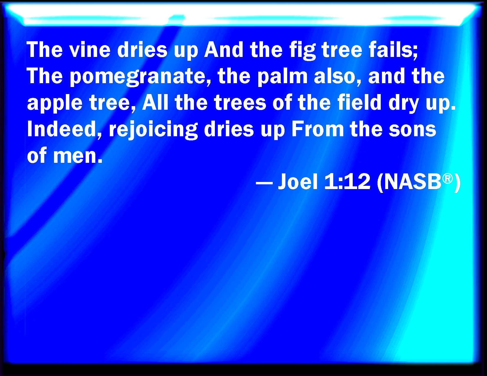 Bible Verse Slide Joel 1:12 The vine is dried up, and the fig tree languishes; the pomegranate tree, the palm tree also, and the apple tree, even all the trees of the field, are withered: because joy is withered away from the sons of men. KJV: The vine is dried up, and the fig tree languisheth; the pomegranate tree, the palm tree also, and the apple tree, even all the trees of the field, are withered: because joy is withered away from the sons of men. DRB: The vineyard is confounded, and the fig tree hath languished: the pomegranate tree, and the palm tree, and the apple tree, and all the trees of the field are withered: because joy is withdrawn from the children of men. DBT: The vine is dried up, and the fig-tree languisheth; the pomegranate-tree, the palm also and the apple-tree; all the trees of the field are withered, yea, joy is withered away from the children of men. ERV: The vine is withered, and the fig tree languisheth; the pomegranate tree, the palm tree also, and the apple tree, even all the trees of the field are withered: for joy is withered away from the sons of men. WBT: The vine is dried up, and the fig-tree languisheth; the pomegranate-tree, the palm-tree also, and the apple-tree, even all the trees of the field, are withered: because joy is withered away from the sons of men. WEB: The vine has dried up, and the fig tree withered; the pomegranate tree, the palm tree also, and the apple tree, even all of the trees of the field are withered; for joy has withered away from the sons of men. YLT: The vine hath been dried up, And the fig-tree doth languish, Pomegranate, also palm, and apple-tree, All trees of the field have withered, For dried up hath been joy from the sons of men.Links Joel 1:12 NIV • Joel 1:12 NLT • Joel 1:12 ESV • Joel 1:12 NASB • Joel 1:12 KJV • Joel 1:12 Interlinear • Joel 1:12 Commentaries • Joel 1:12 Parallel Texts • Joel 1:12 Bible Apps • Joel 1:12 Parallel • Bible Hub |