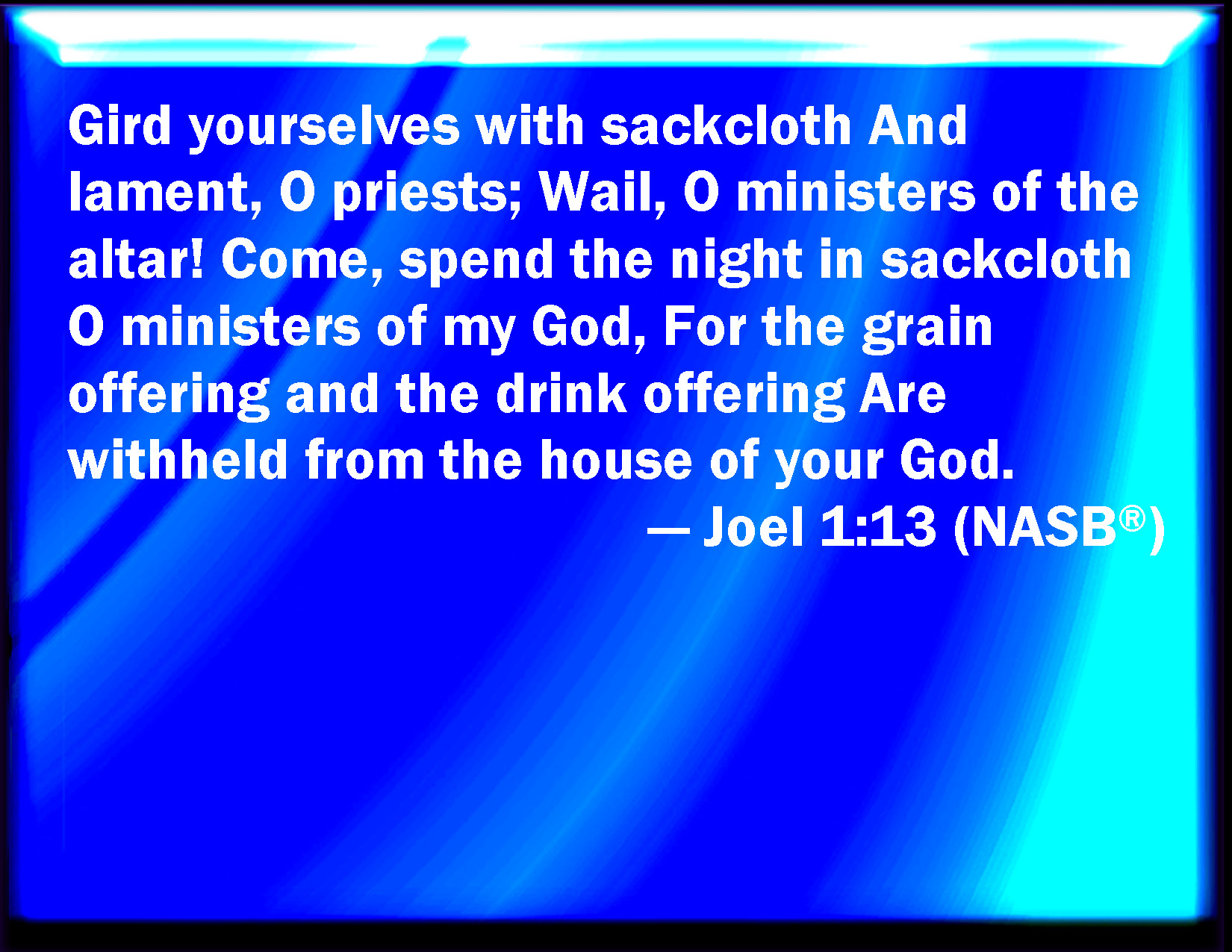 Bible Verse Slide Joel 1:13 Gird yourselves, and lament, you priests: howl, you ministers of the altar: come, lie all night in sackcloth, you ministers of my God: for the meat offering and the drink offering is withheld from the house of your God. KJV: Gird yourselves, and lament, ye priests: howl, ye ministers of the altar: come, lie all night in sackcloth, ye ministers of my God: for the meat offering and the drink offering is withholden from the house of your God. DRB: Gird yourselves, and lament, O ye priests, howl, ye ministers of the altars: go in, lie in sackcloth, ye ministers of my God: because sacrifice and libation is cut off from the house of your God. DBT: Gird yourselves, and lament, ye priests; howl, ministers of the altar; come, lie all night in sackcloth, ye ministers of my God: for the oblation and the drink-offering are withholden from the house of your God. ERV: Gird yourselves with sackcloth, and lament, ye priests; howl, ye ministers of the altar; come, lie all night in sackcloth, ye ministers of my God: for the meal offering and the drink offering is withholden from the house of your God. WBT: Gird yourselves, and lament, ye priests: howl, ye ministers of the altar: come, lie all night in sackcloth, ye ministers of my God: for the meat-offering and the drink-offering is withheld from the house of your God. WEB: Put on sackcloth and mourn, you priests! Wail, you ministers of the altar. Come, lie all night in sackcloth, you ministers of my God, for the meal offering and the drink offering are withheld from your God's house. YLT: Gird, and lament, ye priests, Howl, ye ministrants of the altar, Come in, lodge in sackcloth, ministrants of my God, For withheld from the house of your God hath been present and libation.Links Joel 1:13 NIV • Joel 1:13 NLT • Joel 1:13 ESV • Joel 1:13 NASB • Joel 1:13 KJV • Joel 1:13 Interlinear • Joel 1:13 Commentaries • Joel 1:13 Parallel Texts • Joel 1:13 Bible Apps • Joel 1:13 Parallel • Bible Hub |