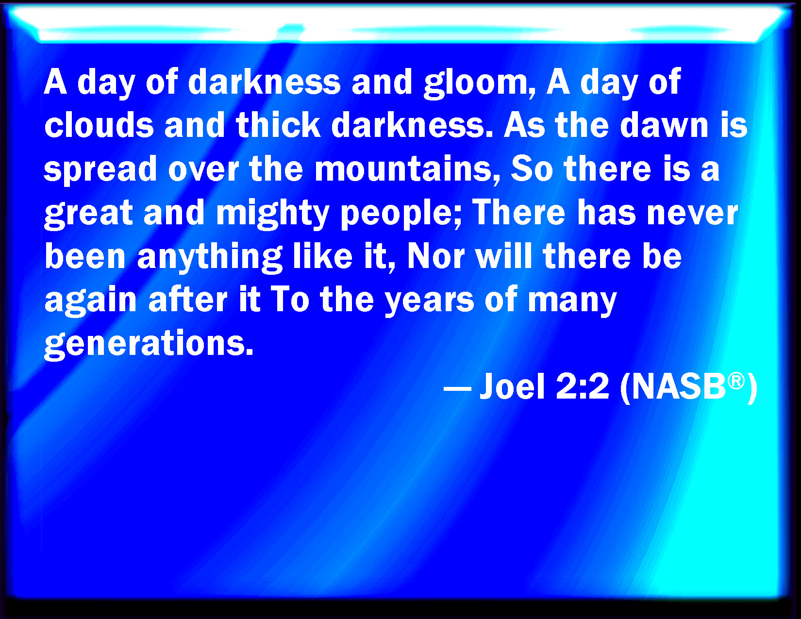 Bible Verse Slide Joel 2:2 A day of darkness and of gloominess, a day of clouds and of thick darkness, as the morning spread on the mountains: a great people and a strong; there has not been ever the like, neither shall be any more after it, even to the years of many generations. KJV: A day of darkness and of gloominess, a day of clouds and of thick darkness, as the morning spread upon the mountains: a great people and a strong; there hath not been ever the like, neither shall be any more after it, even to the years of many generations. DRB: A day of darkness, and of gloominess, a day of clouds and whirlwinds: a numerous and strong people as the morning spread upon the mountains: the like to it hath not been from the beginning, nor shall be after it even to the years of generation and generation. DBT: a day of darkness and gloom, a day of clouds and gross darkness, as the dawn spread upon the mountains; a great people and a strong; there hath not been ever the like, neither shall be any more after them, to the years of generations and generations. ERV: a day of darkness and gloominess, a day of clouds and thick darkness, as the dawn spread upon the mountains; a great people and a strong, there hath not been ever the like, neither shall be any more after them, even to the years of many generations. WBT: A day of darkness and of gloominess, a day of clouds and of thick darkness, as the morning spread upon the mountains: a great people and a strong; there hath not been ever the like, neither shall be any more after it, even to the years of many generations. WEB: A day of darkness and gloominess, a day of clouds and thick darkness. As the dawn spreading on the mountains, a great and strong people; there has never been the like, neither will there be any more after them, even to the years of many generations. YLT: A day of darkness and thick darkness, A day of cloud and thick darkness, As darkness spread on the mountains, A people numerous and mighty, Like it there hath not been from of old, And after it there is not again — till the years of generation and generation.Links Joel 2:2 NIV • Joel 2:2 NLT • Joel 2:2 ESV • Joel 2:2 NASB • Joel 2:2 KJV • Joel 2:2 Interlinear • Joel 2:2 Commentaries • Joel 2:2 Parallel Texts • Joel 2:2 Bible Apps • Joel 2:2 Parallel • Bible Hub |