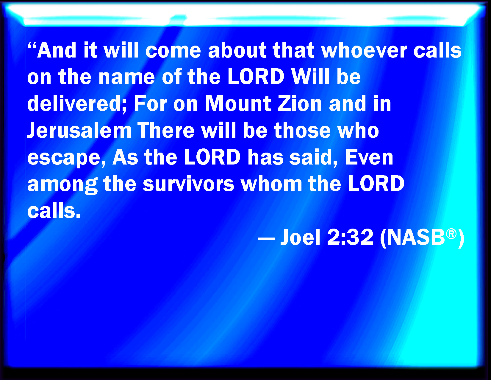 Bible Verse Slide Joel 2:32 And it shall come to pass, that whoever shall call on the name of the LORD shall be delivered: for in mount Zion and in Jerusalem shall be deliverance, as the LORD has said, and in the remnant whom the LORD shall call. KJV: And it shall come to pass, that whosoever shall call on the name of the LORD shall be delivered: for in mount Zion and in Jerusalem shall be deliverance, as the LORD hath said, and in the remnant whom the LORD shall call. DRB: And it shall come to pass, that every one that shall call upon the name of the Lord shall be saved: for in mount Sion, and in Jerusalem shall be salvation, as the Lord hath said, and in the residue whom the Lord shall call. DBT: And it shall be that whosoever shall call upon the name of Jehovah shall be saved: for in mount Zion and in Jerusalem shall be deliverance, as Jehovah hath said, and for the residue whom Jehovah shall call. ERV: And it shall come to pass, that whosoever shall call on the name of the LORD shall be delivered: for in mount Zion and in Jerusalem there shall be those that escape, as the LORD hath said, and among the remnant those whom the LORD doth call. WBT: And it shall come to pass, that whoever shall call on the name of the LORD shall be delivered: for in mount Zion and in Jerusalem shall be deliverance, as the LORD hath said, and in the remnant whom the LORD shall call. WEB: It will happen that whoever will call on the name of Yahweh shall be saved; for in Mount Zion and in Jerusalem there will be those who escape, as Yahweh has said, and among the remnant, those whom Yahweh calls. YLT: And it hath come to pass, Every one who calleth in the name of Jehovah is delivered, For in mount Zion and in Jerusalem there is an escape, As Jehovah hath said, And among the remnants whom Jehovah is calling!Links Joel 2:32 NIV • Joel 2:32 NLT • Joel 2:32 ESV • Joel 2:32 NASB • Joel 2:32 KJV • Joel 2:32 Interlinear • Joel 2:32 Commentaries • Joel 2:32 Parallel Texts • Joel 2:32 Bible Apps • Joel 2:32 Parallel • Bible Hub |