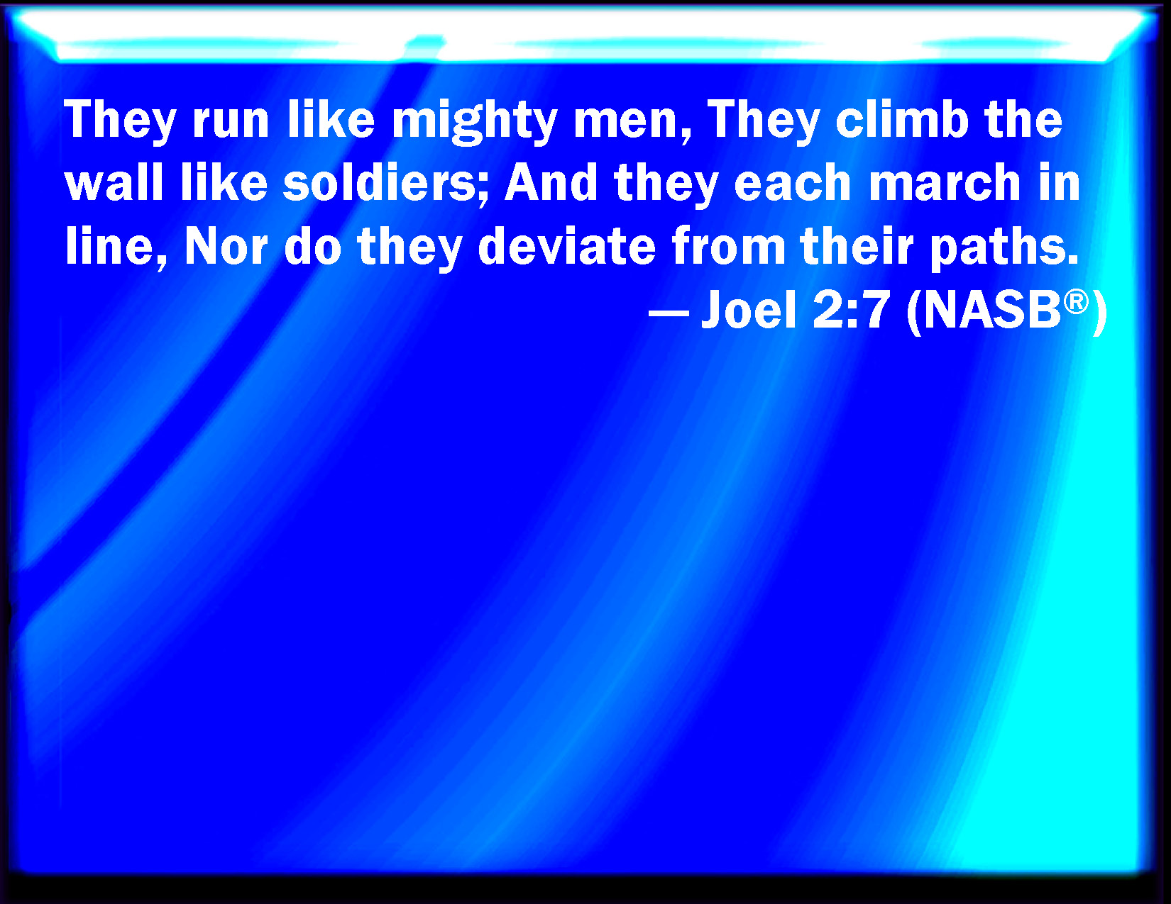 Bible Verse Slide Joel 2:7 They shall run like mighty men; they shall climb the wall like men of war; and they shall march every one on his ways, and they shall not break their ranks: KJV: They shall run like mighty men; they shall climb the wall like men of war; and they shall march every one on his ways, and they shall not break their ranks: DRB: They shall run like valiant men: like men of war they shall scale the wall: the men shall march every one on his way, and they shall not turn aside from their ranks. DBT: They run like mighty men; they climb the wall like men of war; and they march every one on his ways, and break not their ranks. ERV: They run like mighty men; they climb the wall like men of war; and they march every one on his ways, and they break not their ranks. WBT: They shall run like mighty men; they shall climb the wall like men of war; and they shall march every one on his ways, and they shall not break their ranks: WEB: They run like mighty men. They climb the wall like warriors. They each march in his line, and they don't swerve off course. YLT: As mighty ones they run, As men of war they go up a wall, And each in his own ways they do go, And they embarrass not their paths.Links Joel 2:7 NIV • Joel 2:7 NLT • Joel 2:7 ESV • Joel 2:7 NASB • Joel 2:7 KJV • Joel 2:7 Interlinear • Joel 2:7 Commentaries • Joel 2:7 Parallel Texts • Joel 2:7 Bible Apps • Joel 2:7 Parallel • Bible Hub |