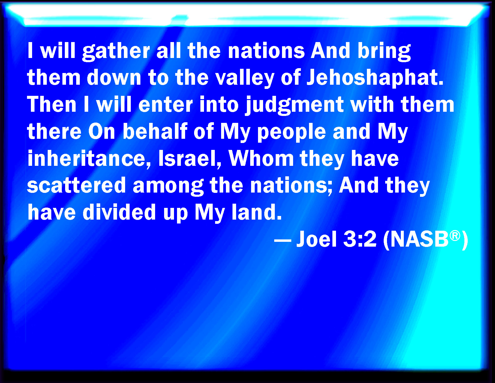 Bible Verse Slide Joel 3:2 I will also gather all nations, and will bring them down into the valley of Jehoshaphat, and will plead with them there for my people and for my heritage Israel, whom they have scattered among the nations, and parted my land. KJV: I will also gather all nations, and will bring them down into the valley of Jehoshaphat, and will plead with them there for my people and for my heritage Israel, whom they have scattered among the nations, and parted my land. DRB: I will gather together all nations, and will bring them down into the valley of Josaphat: and I will plead with them there for my people, and for my inheritance Israel, whom they have scattered among the nations, and have parted my land. DBT: I will also gather all the nations, and will bring them down into the valley of Jehoshaphat, and I will enter into judgment with them there on account of my people and mine inheritance, Israel, whom they have scattered among the nations: and they have parted my land; ERV: I will gather all nations, and will bring them down into the valley of Jehoshaphat; and I will plead with them there for my people and for my heritage Israel, whom they have scattered among the nations, and parted my land. WBT: I will also gather all nations, and will bring them down into the valley of Jehoshaphat, and will plead with them there for my people and for my heritage Israel, whom they have scattered among the nations, and divided my land. WEB: I will gather all nations, and will bring them down into the valley of Jehoshaphat; and I will execute judgment on them there for my people, and for my heritage, Israel, whom they have scattered among the nations. They have divided my land, YLT: Then I have gathered all the nations, And caused them to go down unto the valley of Jehoshaphat, And I have been judged with them there, Concerning My people and Mine inheritance — Israel, Whom they scattered among nations, And My land they have apportioned.Links Joel 3:2 NIV • Joel 3:2 NLT • Joel 3:2 ESV • Joel 3:2 NASB • Joel 3:2 KJV • Joel 3:2 Interlinear • Joel 3:2 Commentaries • Joel 3:2 Parallel Texts • Joel 3:2 Bible Apps • Joel 3:2 Parallel • Bible Hub |