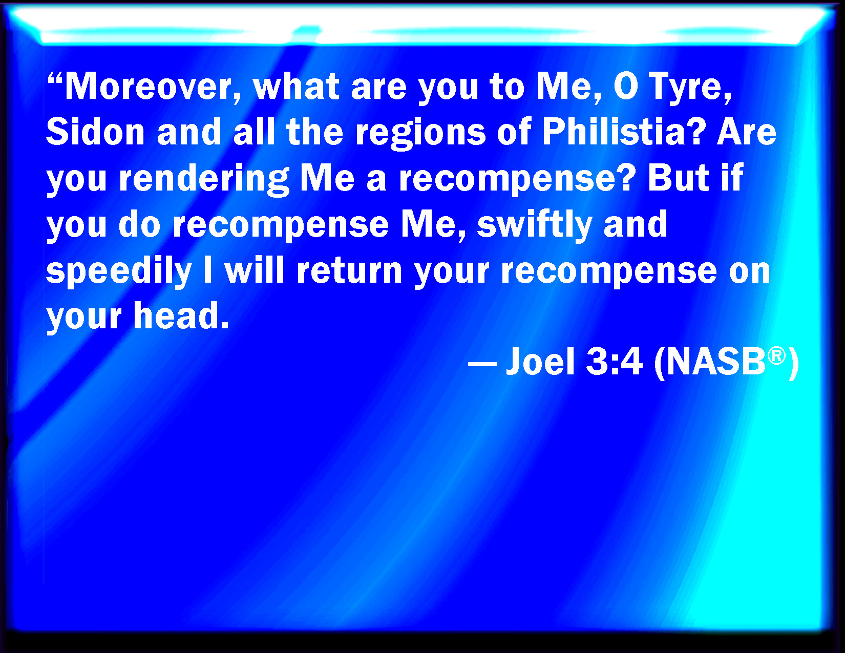 Bible Verse Slide Joel 3:4 Yes, and what have you to do with me, O Tyre, and Zidon, and all the coasts of Palestine? will you render me a recompense? and if you recompense me, swiftly and speedily will I return your recompense on your own head; KJV: Yea, and what have ye to do with me, O Tyre, and Zidon, and all the coasts of Palestine? will ye render me a recompence? and if ye recompense me, swiftly and speedily will I return your recompence upon your own head; DRB: But what have you to do with me, O Tyre, and Sidon, and all the coast of the Philistines? will you revenge yourselves on me? and if you revenge yourselves on me, I will very soon return you a recompense upon your own head. DBT: Yea also, what have ye to do with me, O Tyre and Zidon, and all the districts of Philistia? Will ye render me a recompence? But if ye recompense me, swiftly and speedily will I bring your recompence upon your own head; ERV: Yea, and what are ye to me, O Tyre, and Zidon, and all the regions of Philistia? will ye render me a recompence? and if ye recompense me, swiftly and speedily will I return your recompence upon your own head. WBT: Yes, and what have ye to do with me, O Tyre, and Zidon, and all the coasts of Palestine? will ye render me a recompense? and if ye recompense me, swiftly and speedily I will return your recompense upon your own head; WEB: "Yes, and what are you to me, Tyre, and Sidon, and all the regions of Philistia? Will you repay me? And if you repay me, I will swiftly and speedily return your repayment on your own head. YLT: And also, what are ye to Me, O Tyre and Zidon, And all circuits of Philistia? Recompence are ye rendering unto Me? And if ye are giving recompence to Me, Swiftly, hastily, I turn back your recompence on your head.Links Joel 3:4 NIV • Joel 3:4 NLT • Joel 3:4 ESV • Joel 3:4 NASB • Joel 3:4 KJV • Joel 3:4 Interlinear • Joel 3:4 Commentaries • Joel 3:4 Parallel Texts • Joel 3:4 Bible Apps • Joel 3:4 Parallel • Bible Hub |