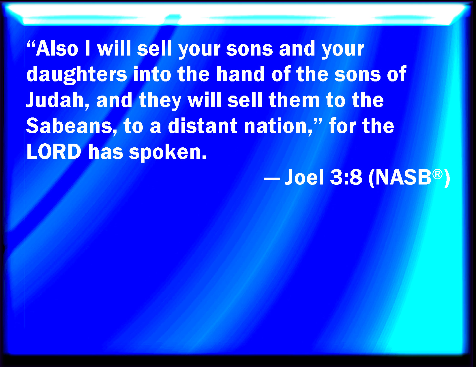 Bible Verse Slide Joel 3:8 And I will sell your sons and your daughters into the hand of the children of Judah, and they shall sell them to the Sabeans, to a people far off: for the LORD has spoken it. KJV: And I will sell your sons and your daughters into the hand of the children of Judah, and they shall sell them to the Sabeans, to a people far off: for the LORD hath spoken it. DRB: And I will sell your sons, and your daughters by the hands of the children of Juda, and they shall sell them to the Sabeans, a nation far off, for the Lord hath spoken it. DBT: And I will sell your sons and your daughters into the hand of the children of Judah, and they shall sell them to the Sabeans, to a nation far off: for Jehovah hath spoken. ERV: and I will sell your sons and your daughters into the hand of the children of Judah, and they shall sell them to the men of Sheba, to a nation far off: for the LORD hath spoken it. WBT: And I will sell your sons and your daughters into the hand of the children of Judah, and they shall sell them to the Sabeans, to a people far off: for the LORD hath spoken it. WEB: and I will sell your sons and your daughters into the hands of the children of Judah, and they will sell them to the men of Sheba, to a faraway nation, for Yahweh has spoken it." YLT: And have sold your sons and your daughters Into the hand of the sons of Judah, And they have sold them to Shabeans, Unto a nation far off, for Jehovah hath spoken.Links Joel 3:8 NIV • Joel 3:8 NLT • Joel 3:8 ESV • Joel 3:8 NASB • Joel 3:8 KJV • Joel 3:8 Interlinear • Joel 3:8 Commentaries • Joel 3:8 Parallel Texts • Joel 3:8 Bible Apps • Joel 3:8 Parallel • Bible Hub |