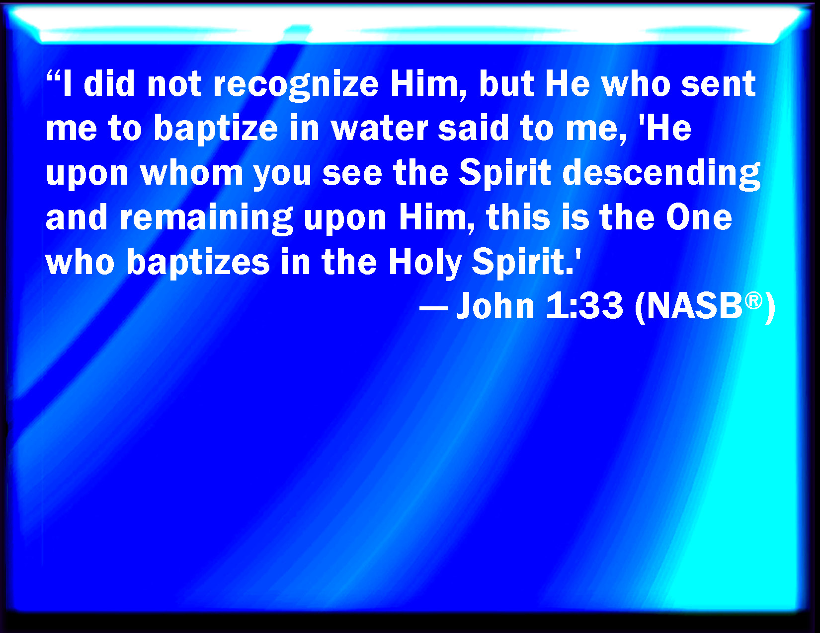 Bible Verse Slide John 1:33 And I knew him not: but he that sent me to baptize with water, the same said to me, On whom you shall see the Spirit descending, and remaining on him, the same is he which baptizes with the Holy Ghost. KJV: And I knew him not: but he that sent me to baptize with water, the same said unto me, Upon whom thou shalt see the Spirit descending, and remaining on him, the same is he which baptizeth with the Holy Ghost. DRB: And I knew him not; but he who sent me to baptize with water, said to me: He upon whom thou shalt see the Spirit descending, and remaining upon him, he it is that baptizeth with the Holy Ghost. DBT: And I knew him not; but he who sent me to baptise with water, he said to me, Upon whom thou shalt see the Spirit descending and abiding on him, he it is who baptises with the Holy Spirit. ERV: And I knew him not: but he that sent me to baptize with water, he said unto me, Upon whomsoever thou shalt see the Spirit descending, and abiding upon him, the same is he that baptizeth with the Holy Spirit. WBT: And I knew him not: but he that sent me to baptize with water, the same said to me, Upon whom thou shalt see the Spirit descending and remaining on him, the same is he who baptizeth with the Holy Spirit. WEB: I didn't recognize him, but he who sent me to baptize in water, he said to me, 'On whomever you will see the Spirit descending, and remaining on him, the same is he who baptizes in the Holy Spirit.' YLT: and I did not know him, but he who sent me to baptize with water, He said to me, On whomsoever thou mayest see the Spirit coming down, and remaining on him, this is he who is baptizing with the Holy Spirit;Links John 1:33 NIV • John 1:33 NLT • John 1:33 ESV • John 1:33 NASB • John 1:33 KJV • John 1:33 Interlinear • John 1:33 Commentaries • John 1:33 Parallel Texts • John 1:33 Bible Apps • John 1:33 Parallel • Bible Hub |