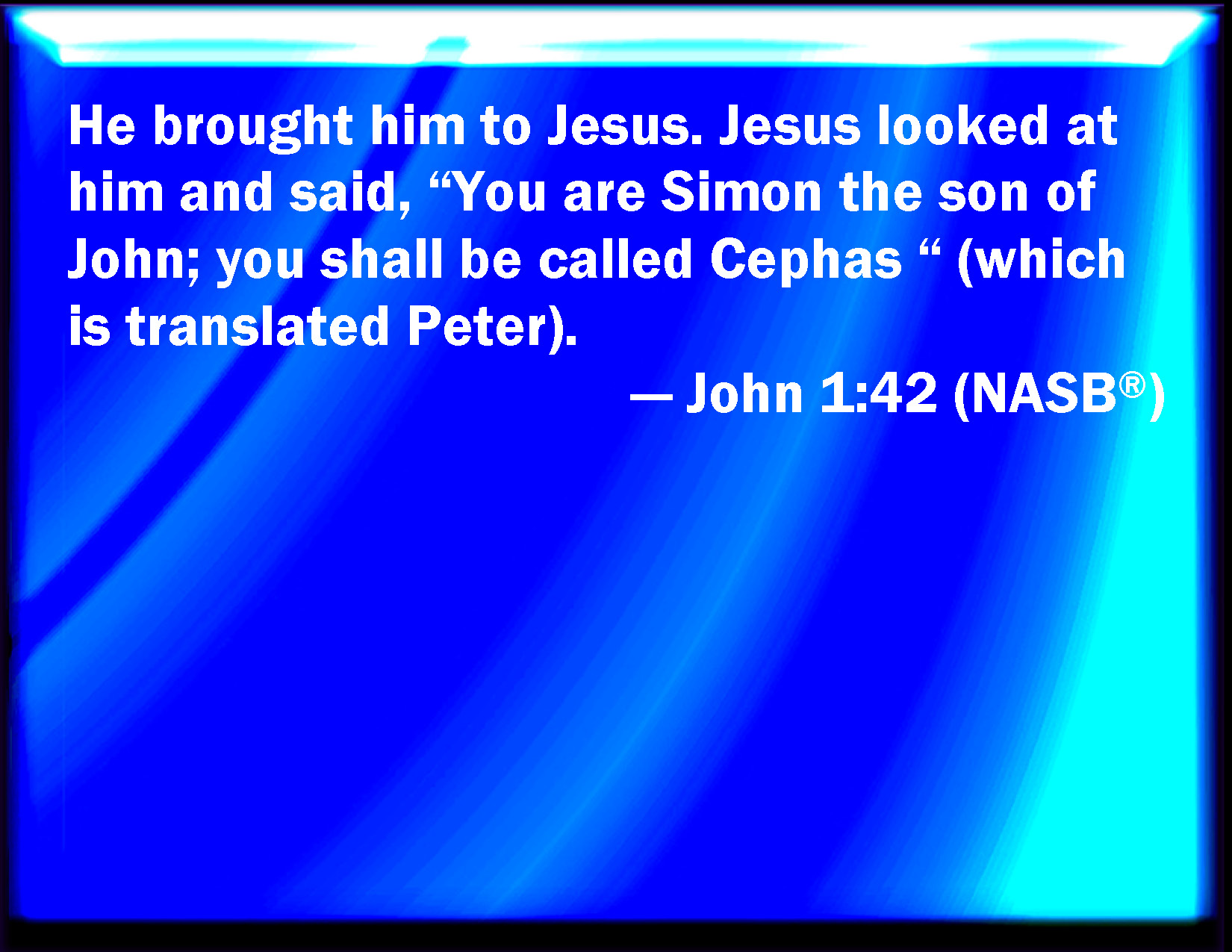 Bible Verse Slide John 1:42 And he brought him to Jesus. And when Jesus beheld him, he said, You are Simon the son of Jona: you shall be called Cephas, which is by interpretation, A stone. KJV: And he brought him to Jesus. And when Jesus beheld him, he said, Thou art Simon the son of Jona: thou shalt be called Cephas, which is by interpretation, A stone. DRB: And he brought him to Jesus. And Jesus looking upon him, said: Thou art Simon the son of Jona: thou shalt be called Cephas, which is interpreted Peter. DBT: And he led him to Jesus. Jesus looking at him said, Thou art Simon, the son of Jonas; thou shalt be called Cephas (which interpreted is stone). ERV: He brought him unto Jesus. Jesus looked upon him, and said, Thou art Simon the son of John: thou shalt be called Cephas (which is by interpretation, Peter). WBT: And he brought him to Jesus. And when Jesus beheld him, he said, Thou art Simon the son of Jona: thou shalt be called Cephas; which is, by interpretation, a stone. WEB: He brought him to Jesus. Jesus looked at him, and said, "You are Simon the son of Jonah. You shall be called Cephas" (which is by interpretation, Peter). YLT: and he brought him unto Jesus: and having looked upon him, Jesus saith, 'Thou art Simon, the son of Jonas, thou shalt be called Cephas,' (which is interpreted, A rock.)Links John 1:42 NIV • John 1:42 NLT • John 1:42 ESV • John 1:42 NASB • John 1:42 KJV • John 1:42 Interlinear • John 1:42 Commentaries • John 1:42 Parallel Texts • John 1:42 Bible Apps • John 1:42 Parallel • Bible Hub |