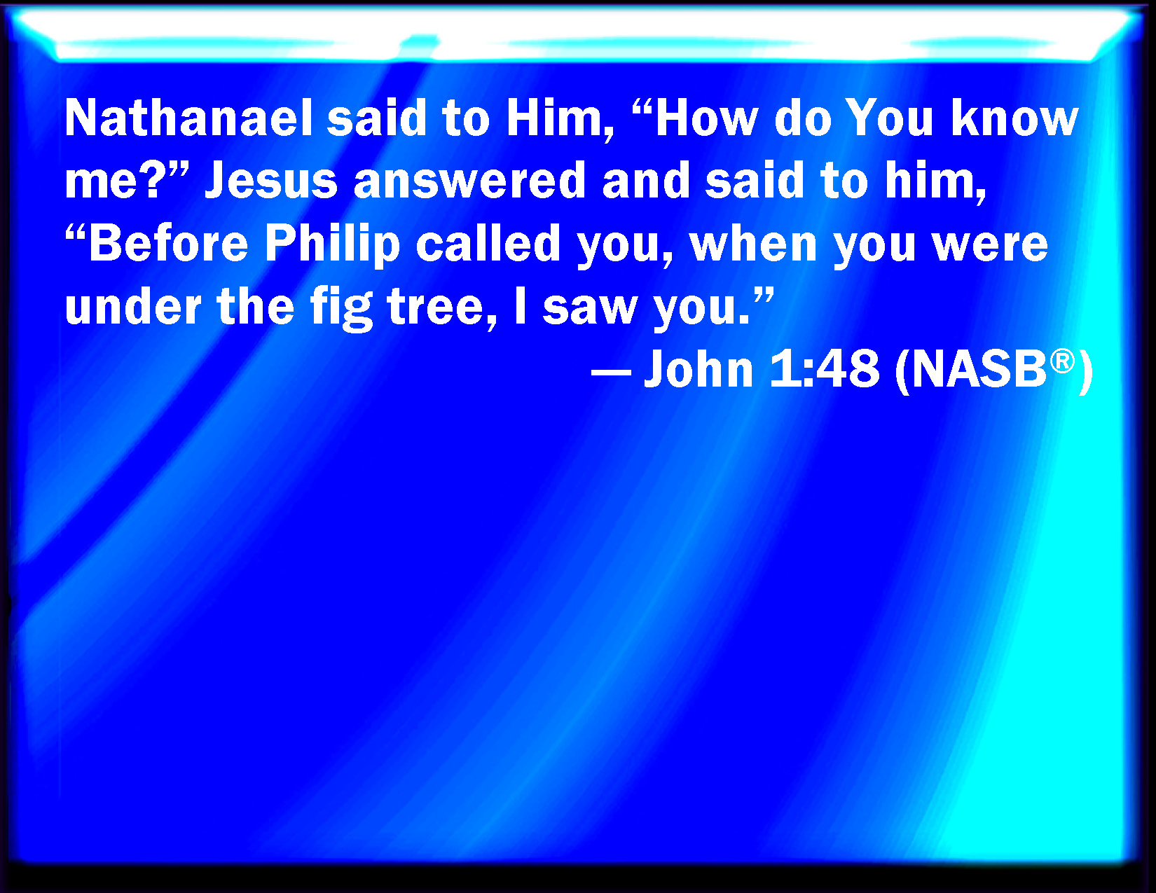 Bible Verse Slide John 1:48 Nathanael said to him, From where know you me? Jesus answered and said to him, Before that Philip called you, when you were under the fig tree, I saw you. KJV: Nathanael saith unto him, Whence knowest thou me? Jesus answered and said unto him, Before that Philip called thee, when thou wast under the fig tree, I saw thee. DRB: Nathanael saith to him: Whence knowest thou me? Jesus answered, and said to him: Before that Philip called thee, when thou wast under the fig tree, I saw thee. DBT: Nathanael says to him, Whence knowest thou me? Jesus answered and said to him, Before that Philip called thee, when thou wast under the fig-tree, I saw thee. ERV: Nathanael saith unto him, Whence knowest thou me? Jesus answered and said unto him, Before Philip called thee, when thou wast under the fig tree, I saw thee. WBT: Nathanael saith to him, Whence knowest thou me? Jesus answered and said to him, Before Philip called thee, when thou wast under the fig-tree, I saw thee. WEB: Nathanael said to him, "How do you know me?" Jesus answered him, "Before Philip called you, when you were under the fig tree, I saw you." YLT: Nathanael saith to him, 'Whence me dost thou know?' Jesus answered and said to him, 'Before Philip's calling thee — thou being under the fig-tree — I saw thee.'Links John 1:48 NIV • John 1:48 NLT • John 1:48 ESV • John 1:48 NASB • John 1:48 KJV • John 1:48 Interlinear • John 1:48 Commentaries • John 1:48 Parallel Texts • John 1:48 Bible Apps • John 1:48 Parallel • Bible Hub |