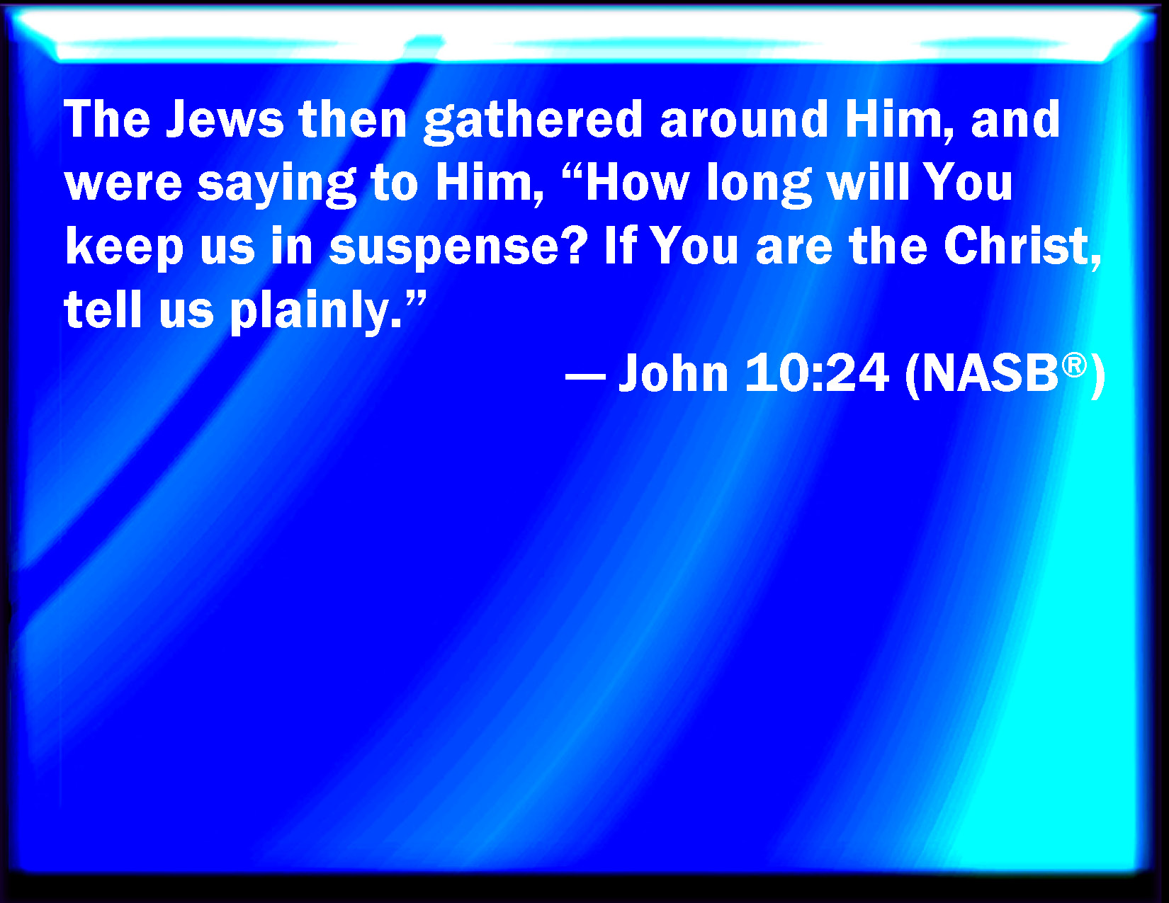 Bible Verse Slide John 10:24 Then came the Jews round about him, and said to him, How long do you make us to doubt? If you be the Christ, tell us plainly. KJV: Then came the Jews round about him, and said unto him, How long dost thou make us to doubt? If thou be the Christ, tell us plainly. DRB: The Jews therefore came round about him, and said to him: How long dost thou hold our souls in suspense? If thou be the Christ, tell us plainly. DBT: The Jews therefore surrounded him, and said to him, Until when dost thou hold our soul in suspense? If thou art the Christ, say so to us openly. ERV: The Jews therefore came round about him, and said unto him, How long dost thou hold us in suspense? If thou art the Christ, tell us plainly. WBT: Then came the Jews around him, and said to him, How long dost thou make us to doubt? If thou art the Christ, tell us plainly. WEB: The Jews therefore came around him and said to him, "How long will you hold us in suspense? If you are the Christ, tell us plainly." YLT: the Jews, therefore, came round about him, and said to him, 'Till when our soul dost thou hold in suspense? if thou art the Christ, tell us freely.'Links John 10:24 NIV • John 10:24 NLT • John 10:24 ESV • John 10:24 NASB • John 10:24 KJV • John 10:24 Interlinear • John 10:24 Commentaries • John 10:24 Parallel Texts • John 10:24 Bible Apps • John 10:24 Parallel • Bible Hub |