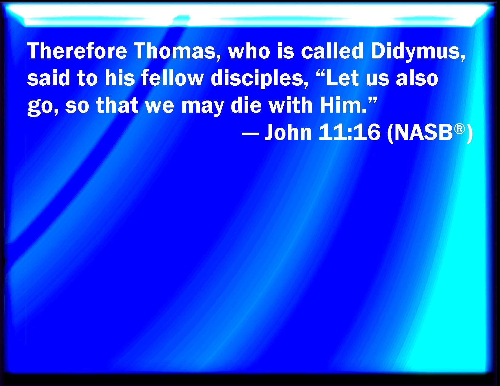 Bible Verse Slide John 11:16 Then said Thomas, which is called Didymus, to his fellow disciples, Let us also go, that we may die with him. KJV: Then said Thomas, which is called Didymus, unto his fellowdisciples, Let us also go, that we may die with him. DRB: Thomas therefore, who is called Didymus, said to his fellow disciples: Let us also go, that we may die with him. DBT: Thomas therefore, called Didymus, said to his fellow disciples, Let us also go, that we may die with him. ERV: Thomas therefore, who is called Didymus, said unto his fellow-disciples, Let us also go, that we may die with him. WBT: Then said Thomas, who is called Didymus, to his fellow-disciples, Let us also go, that we may die with him. WEB: Thomas therefore, who is called Didymus, said to his fellow disciples, "Let's go also, that we may die with him." YLT: therefore said Thomas, who is called Didymus, to the fellow-disciples, 'We may go — we also, that we may die with him,'Links John 11:16 NIV • John 11:16 NLT • John 11:16 ESV • John 11:16 NASB • John 11:16 KJV • John 11:16 Interlinear • John 11:16 Commentaries • John 11:16 Parallel Texts • John 11:16 Bible Apps • John 11:16 Parallel • Bible Hub |