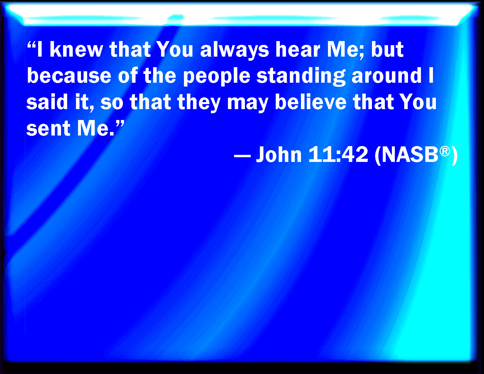 Bible Verse Slide John 11:42 And I knew that you hear me always: but because of the people which stand by I said it, that they may believe that you have sent me. KJV: And I knew that thou hearest me always: but because of the people which stand by I said it, that they may believe that thou hast sent me. DRB: And I knew that thou hearest me always; but because of the people who stand about have I said it, that they may believe that thou hast sent me. DBT: but I knew that thou always hearest me; but on account of the crowd who stand around I have said it, that they may believe that thou hast sent me. ERV: And I knew that thou hearest me always: but because of the multitude which standeth around I said it, that they may believe that thou didst send me. WBT: And I knew that thou hearest me always: but because of the people who stand by, I said it, that they may believe that thou hast sent me. WEB: I know that you always listen to me, but because of the multitude that stands around I said this, that they may believe that you sent me." YLT: and I knew that Thou always dost hear me, but, because of the multitude that is standing by, I said it, that they may believe that Thou didst send me.'Links John 11:42 NIV • John 11:42 NLT • John 11:42 ESV • John 11:42 NASB • John 11:42 KJV • John 11:42 Interlinear • John 11:42 Commentaries • John 11:42 Parallel Texts • John 11:42 Bible Apps • John 11:42 Parallel • Bible Hub |