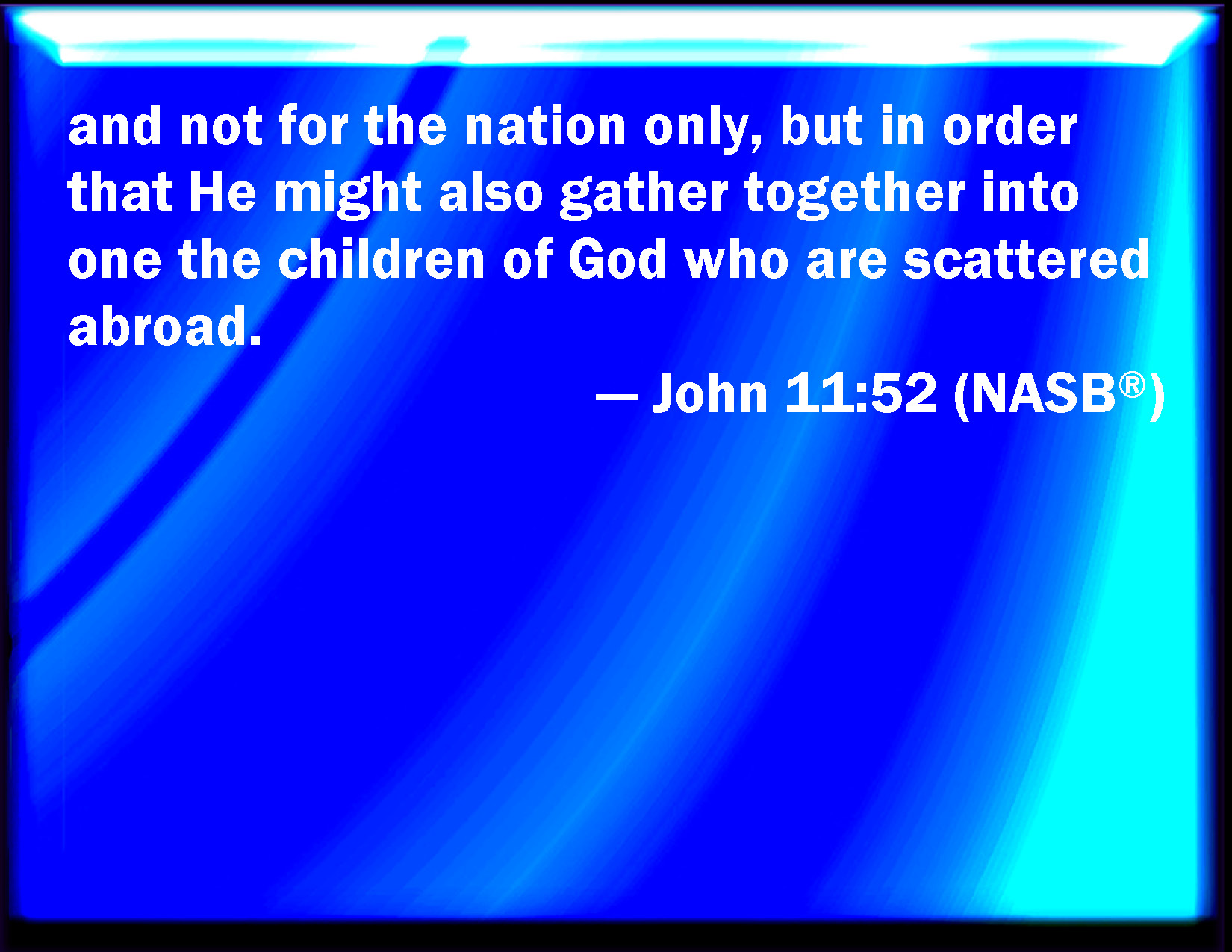 Bible Verse Slide John 11:52 And not for that nation only, but that also he should gather together in one the children of God that were scattered abroad. KJV: And not for that nation only, but that also he should gather together in one the children of God that were scattered abroad. DRB: And not only for the nation, but to gather together in one the children of God, that were dispersed. DBT: and not for the nation only, but that he should also gather together into one the children of God who were scattered abroad. ERV: and not for the nation only, but that he might also gather together into one the children of God that are scattered abroad. WBT: And not for that nation only, but that also he should assemble in one the children of God that were scattered abroad. WEB: and not for the nation only, but that he might also gather together into one the children of God who are scattered abroad. YLT: and not for the nation only, but that also the children of God, who have been scattered abroad, he may gather together into one.Links John 11:52 NIV • John 11:52 NLT • John 11:52 ESV • John 11:52 NASB • John 11:52 KJV • John 11:52 Interlinear • John 11:52 Commentaries • John 11:52 Parallel Texts • John 11:52 Bible Apps • John 11:52 Parallel • Bible Hub |