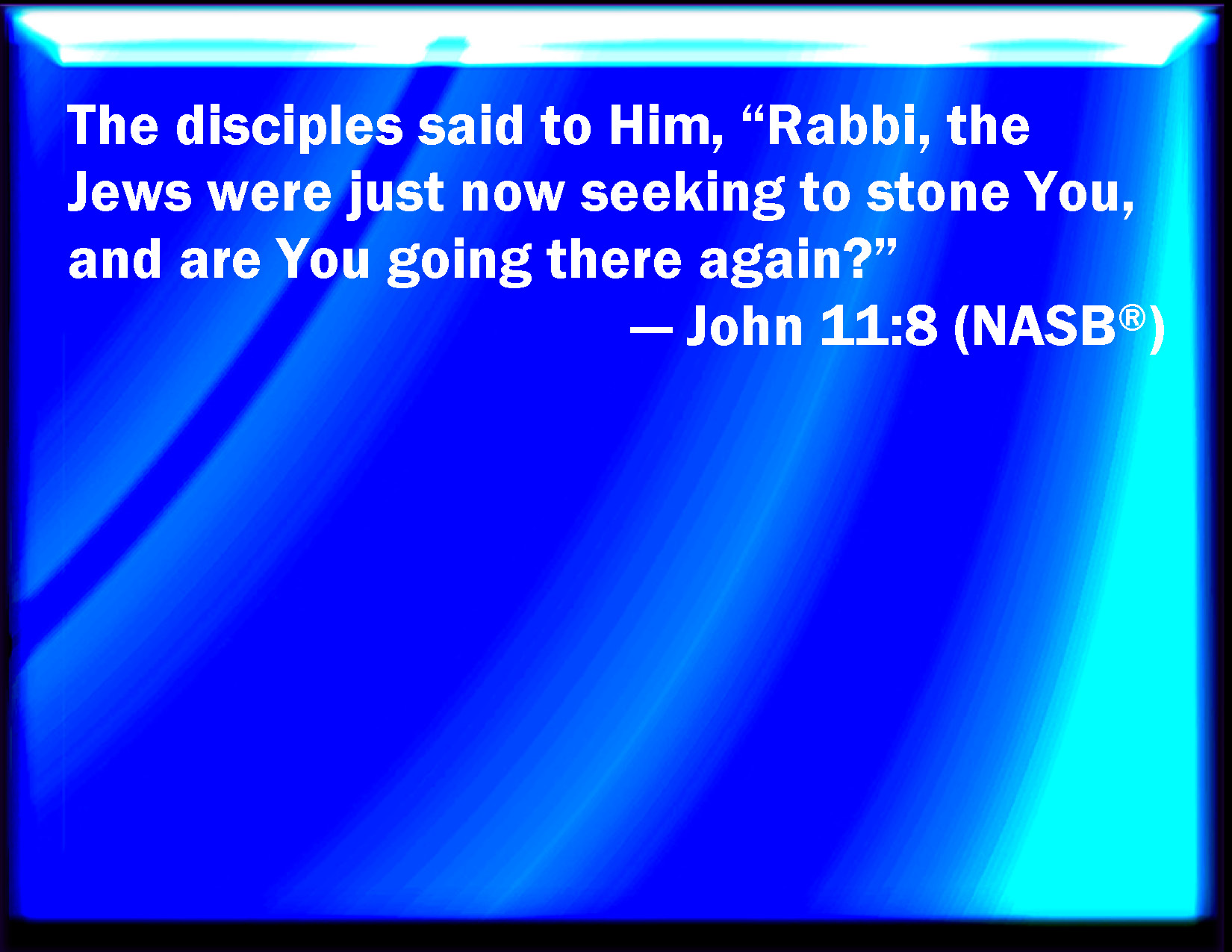 Bible Verse Slide John 11:8 His disciples say to him, Master, the Jews of late sought to stone you; and go you thither again? KJV: His disciples say unto him, Master, the Jews of late sought to stone thee; and goest thou thither again? DRB: The disciples say to him: Rabbi, the Jews but now sought to stone thee: and goest thou thither again? DBT: The disciples say to him, Rabbi, even but now the Jews sought to stone thee, and goest thou thither again? ERV: The disciples say unto him, Rabbi, the Jews were but now seeking to stone thee; and goest thou thither again? WBT: His disciples say to him, Master, the Jews of late sought to stone thee; and goest thou thither again? WEB: The disciples told him, "Rabbi, the Jews were just trying to stone you, and are you going there again?" YLT: the disciples say to him, 'Rabbi, now were the Jews seeking to stone thee, and again thou dost go thither!'Links John 11:8 NIV • John 11:8 NLT • John 11:8 ESV • John 11:8 NASB • John 11:8 KJV • John 11:8 Interlinear • John 11:8 Commentaries • John 11:8 Parallel Texts • John 11:8 Bible Apps • John 11:8 Parallel • Bible Hub |