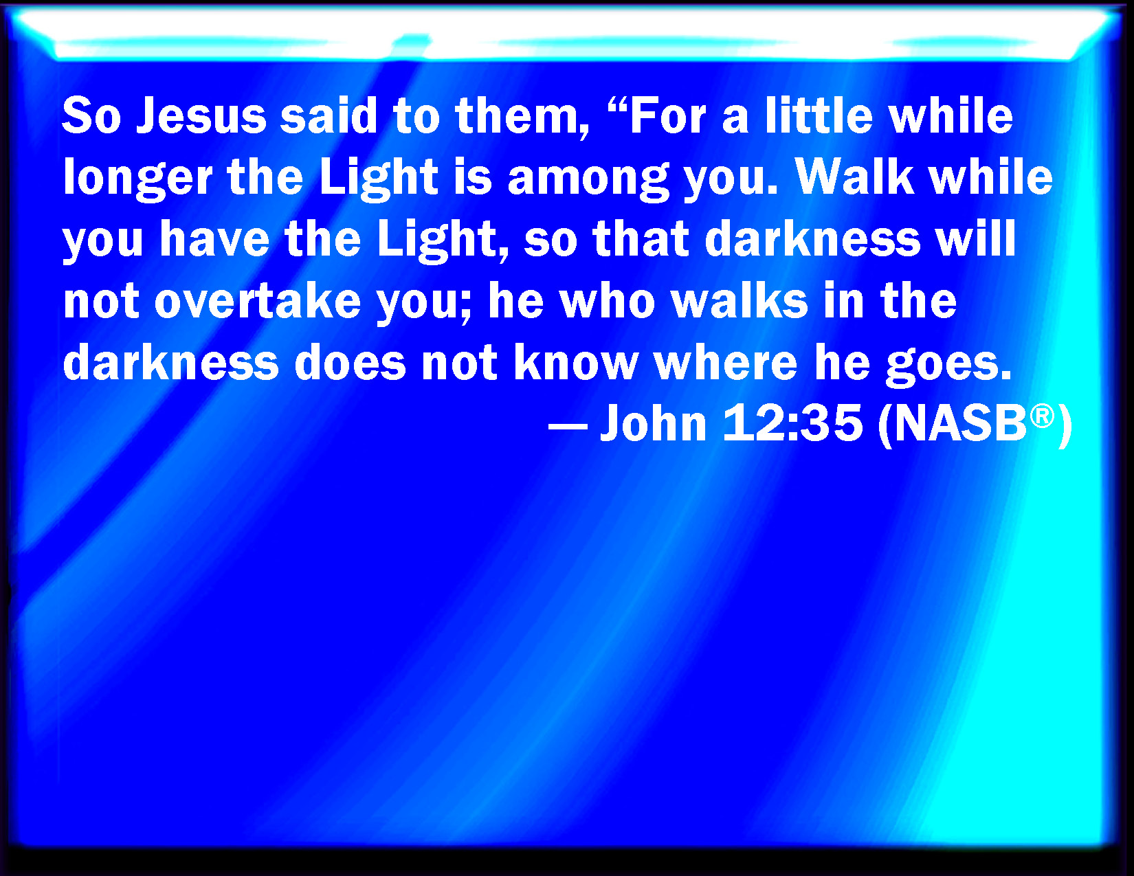 Bible Verse Slide John 12:35 Then Jesus said to them, Yet a little while is the light with you. Walk while you have the light, lest darkness come on you: for he that walks in darkness knows not where he goes. KJV: Then Jesus said unto them, Yet a little while is the light with you. Walk while ye have the light, lest darkness come upon you: for he that walketh in darkness knoweth not whither he goeth. DRB: Jesus therefore said to them: Yet a little while, the light is among you. Walk whilst you have the light, that the darkness overtake you not. And he that walketh in darkness, knoweth not whither he goeth. DBT: Jesus therefore said to them, Yet a little while is the light amongst you. Walk while ye have the light, that darkness may not overtake you. And he who walks in the darkness does not know where he goes. ERV: Jesus therefore said unto them, Yet a little while is the light among you. Walk while ye have the light, that darkness overtake you not: and he that walketh in the darkness knoweth not whither he goeth. WBT: Then Jesus said to them, Yet a little while is the light with you. Walk while ye have the light, lest darkness come upon you: for he that walketh in darkness knoweth not whither he goeth. WEB: Jesus therefore said to them, "Yet a little while the light is with you. Walk while you have the light, that darkness doesn't overtake you. He who walks in the darkness doesn't know where he is going. YLT: Jesus, therefore, said to them, 'Yet a little time is the light with you; walk while ye have the light, that darkness may not overtake you; and he who is walking in the darkness hath not known where he goeth;Links John 12:35 NIV • John 12:35 NLT • John 12:35 ESV • John 12:35 NASB • John 12:35 KJV • John 12:35 Interlinear • John 12:35 Commentaries • John 12:35 Parallel Texts • John 12:35 Bible Apps • John 12:35 Parallel • Bible Hub |