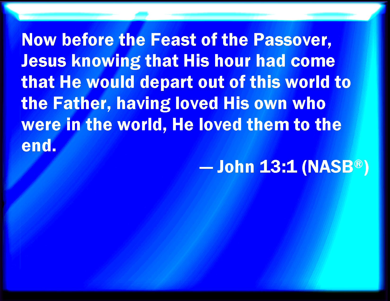 Bible Verse Slide John 13:1 Now before the feast of the passover, when Jesus knew that his hour was come that he should depart out of this world to the Father, having loved his own which were in the world, he loved them to the end. KJV: Now before the feast of the passover, when Jesus knew that his hour was come that he should depart out of this world unto the Father, having loved his own which were in the world, he loved them unto the end. DRB: BEFORE the festival day of the pasch, Jesus knowing that his hour was come, that he should pass out of this world to the Father: having loved his own who were in the world, he loved them unto the end. DBT: Now before the feast of the passover, Jesus, knowing that his hour had come that he should depart out of this world to the Father, having loved his own who were in the world, loved them to the end. ERV: Now before the feast of the passover, Jesus knowing that his hour was come that he should depart out of this world unto the Father, having loved his own which were in the world, he loved them unto the end. WBT: Now before the feast of the passover, when Jesus knew that his hour was come that he should depart out of this world to the Father, having loved his own who were in the world, he loved them to the end. WEB: Now before the feast of the Passover, Jesus, knowing that his time had come that he would depart from this world to the Father, having loved his own who were in the world, he loved them to the end. YLT: And before the feast of the passover, Jesus knowing that his hour hath come, that he may remove out of this world unto the Father, having loved his own who are in the world — to the end he loved them.Links John 13:1 NIV • John 13:1 NLT • John 13:1 ESV • John 13:1 NASB • John 13:1 KJV • John 13:1 Interlinear • John 13:1 Commentaries • John 13:1 Parallel Texts • John 13:1 Bible Apps • John 13:1 Parallel • Bible Hub |